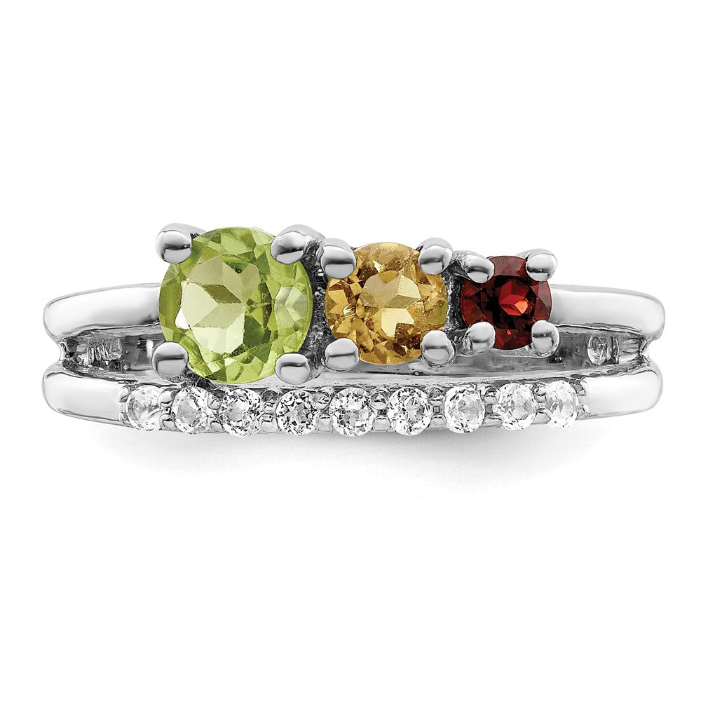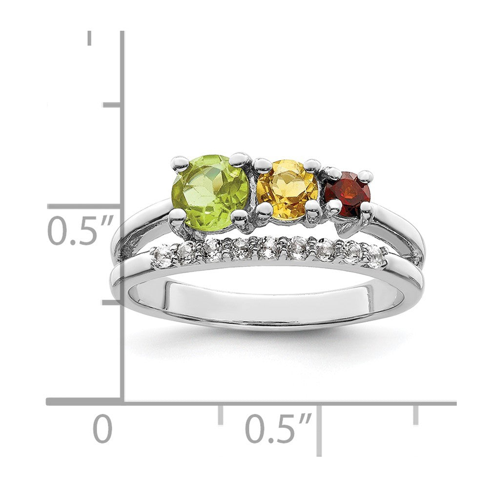 Discover the Sterling Silver Rhodium-Plated 1.02 T.W. Pe/Ci/Ga/Wt Bypass Ring, a stunning piece that combines beauty with craftsmanship. Made of pure 925 sterling silver, it features a polished finish that adds shine and durability. The ring showcases four natural, round gemstones: peridot, citrine, garnet, and white topaz, each set with precision. With a narrow band of 2.45 mm and a head height of 4.5 mm, this women's gemstone ring offers a sleek and elegant look. Perfect for any occasion, this Sterling Silver Rhodium-Plated Bypass Ring is a true statement of style and quality.