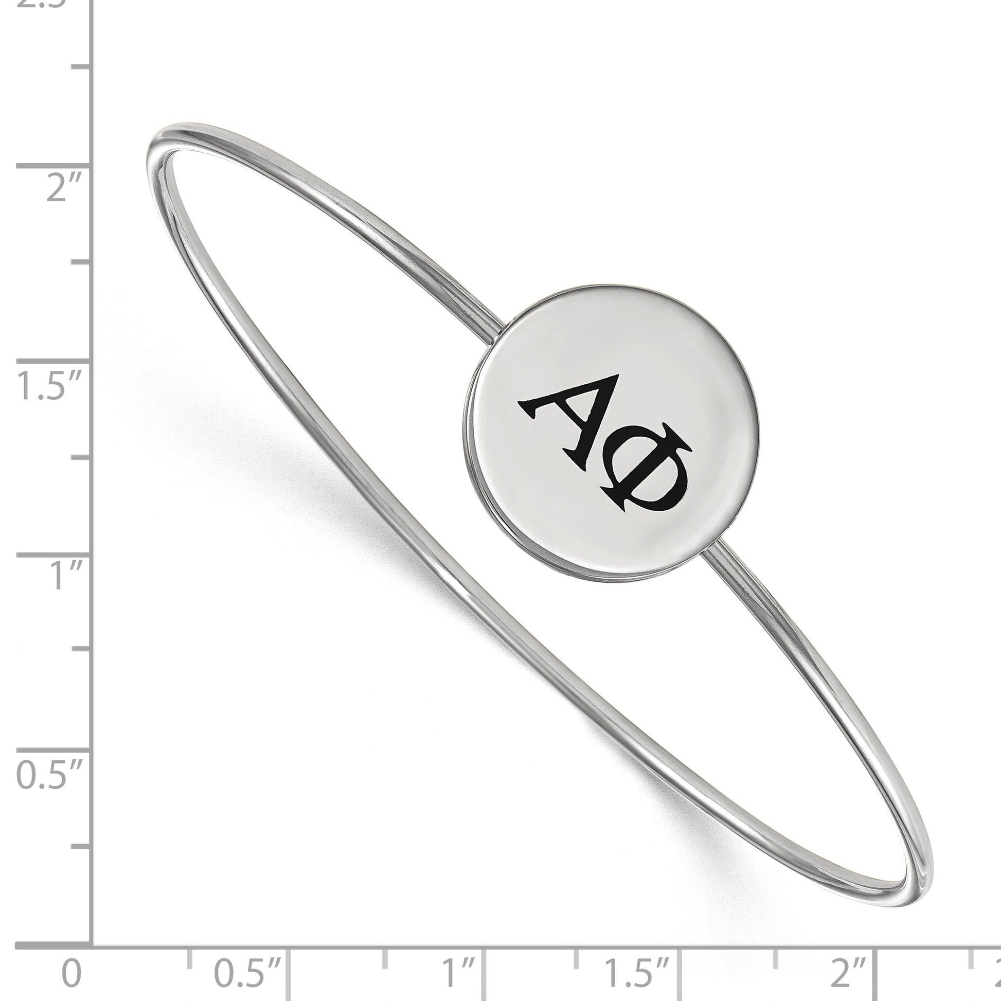 Show off your pride with the Sterling Silver Rh-Plated Logoart Alpha Phi Enameled Slip-On Bangle. Crafted from high-quality 925 sterling silver, this 8-inch bracelet features a sleek 2 mm band and a bold 19 mm charm displaying the Alpha Phi logo. The rhodium plating adds durability and a shiny silver finish that resists tarnish. Perfect for everyday wear, this licensed piece from LogoArt LLC blends style and loyalty effortlessly. Wear the Sterling Silver Rh-Plated Logoart Alpha Phi Enameled Slip-On Bangle and show your sisterhood with pride wherever you go.
