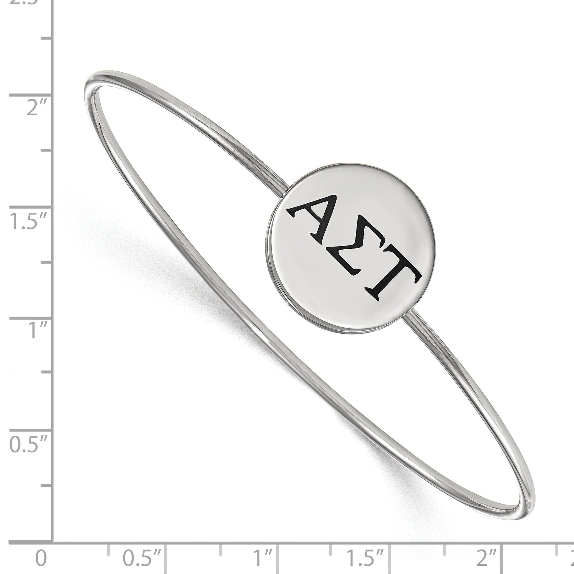Upgrade your collection with the Sterling Silver Rh-Plated Logoart Alpha Sigma Tau Enameled Slip-On Bangle. Crafted from pure sterling silver, this bangle measures 8 inches long with a sleek 2 mm band. Its rhodium plating gives it a bright, shiny finish that resists tarnish. The highlighted charm, 19 mm wide and tall, features the Alpha Sigma Tau Greek license, showcasing your pride. The enameled logo adds a pop of color and style. Perfect for daily wear or special occasions, the Sterling Silver Logoart Alpha Sigma Tau Enameled Bangle is a bold way to show your sisterhood.