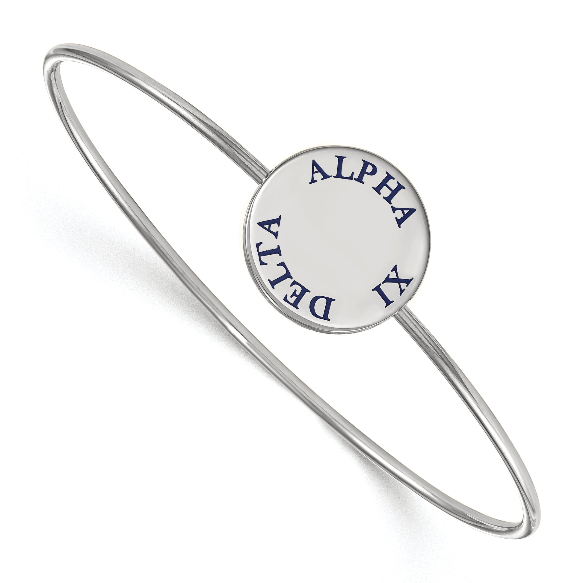 Show off your pride with the Sterling Silver Rh-Plated Logoart Alpha Xi Delta Enameled Slip-On Bangle. This eye-catching bracelet features a sleek 7-inch sterling silver band, polished to shine, with a classic slip-on style that’s easy to wear. The bangle is accented with vibrant blue enamel details and coated in durable rhodium for extra shine. Its lightweight design and bold size make it perfect for daily wear or special moments. Crafted with laser cut precision, the Logoart Alpha Xi Delta bangle is a stylish way to celebrate your sorority spirit.