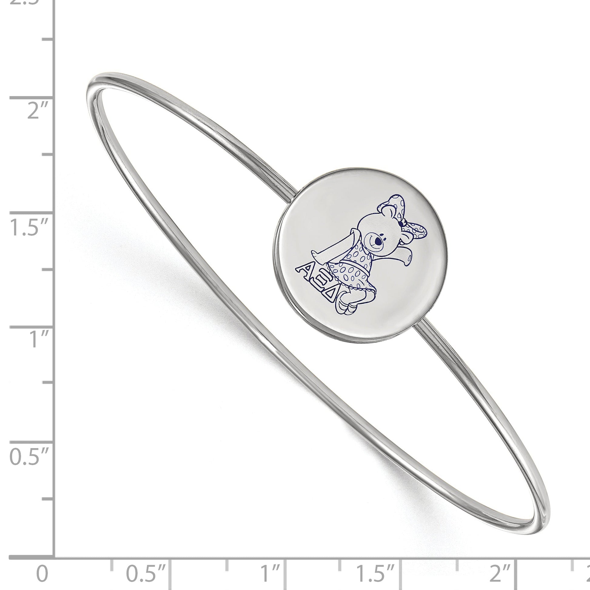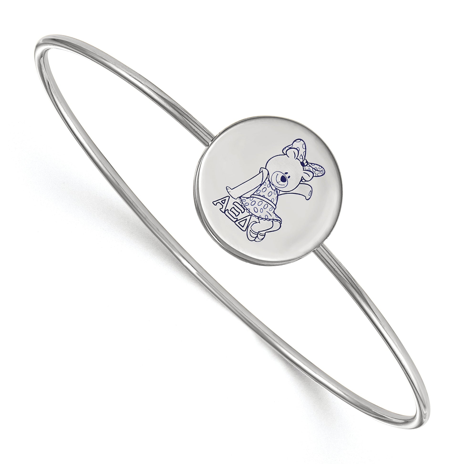 Show off your pride with the Sterling Silver Rh-Plated Logoart Alpha Xi Delta Enameled Slip-On Bangle. Crafted from high-quality 925 sterling silver and finished with a polished look, this bangle features a sleek 7-inch design that easily slips on without a clasp. It is decorated with vibrant blue enamel accents that highlight the Alpha Xi Delta logo, adding a pop of color and style. The band is 2mm wide, making it a bold yet comfortable accessory. Whether for everyday wear or special occasions, the Sterling Silver Logoart Alpha Xi Delta bangle makes a perfect statement piece to showcase your sorority spirit.