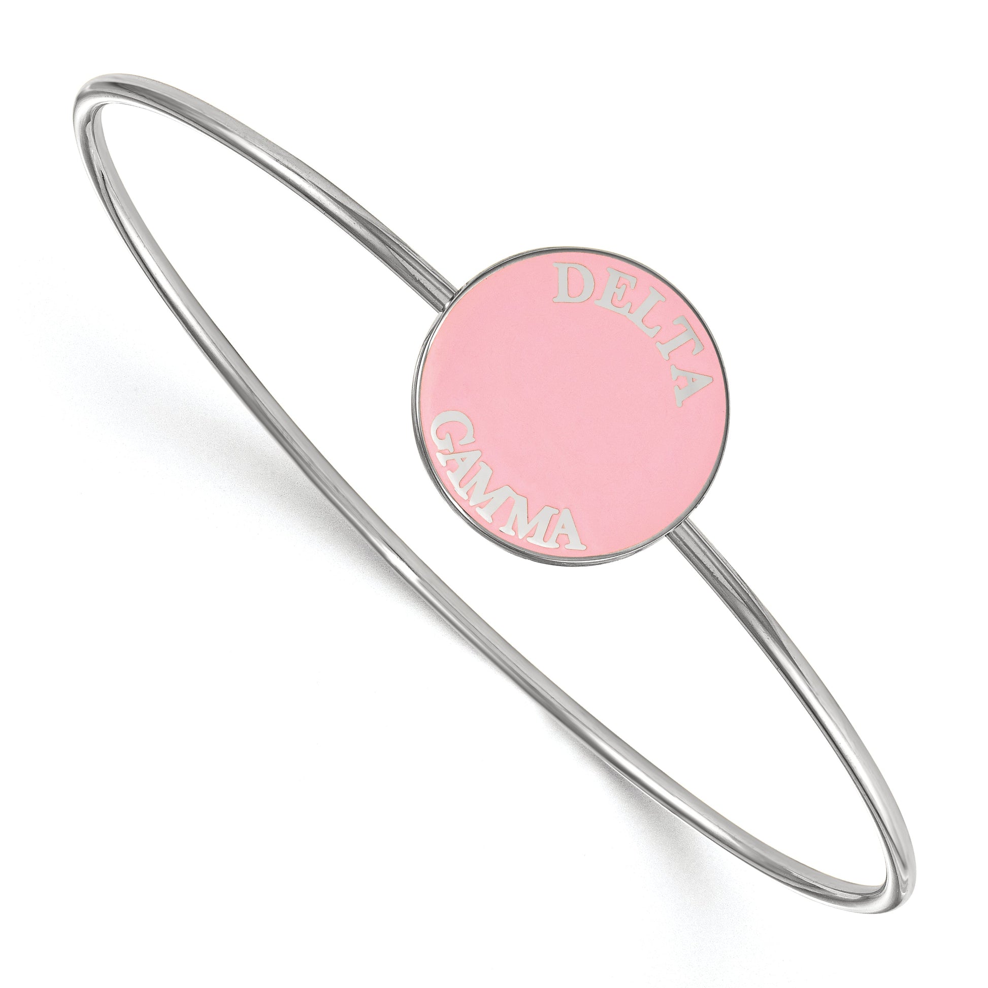 Add style and charm with the Sterling Silver Rh-Plated Logoart Delta Gamma Enameled Slip-On Bangle. This eye-catching bracelet features a sleek 8-inch sterling silver band with a 2 mm width, making it perfect for everyday wear. The rhodium plating adds a brilliant shine, while the Delta Gamma logo charm measures 19 mm square, showcasing the Greek license clearly. Crafted from high-quality sterling silver, this large bracelet offers durability and a light feel on the wrist. Whether you're a Greek life fan or want a bold accessory, the Sterling Silver Rh-Plated Logoart Delta Gamma Enameled Slip-On Bangle is a must-have.