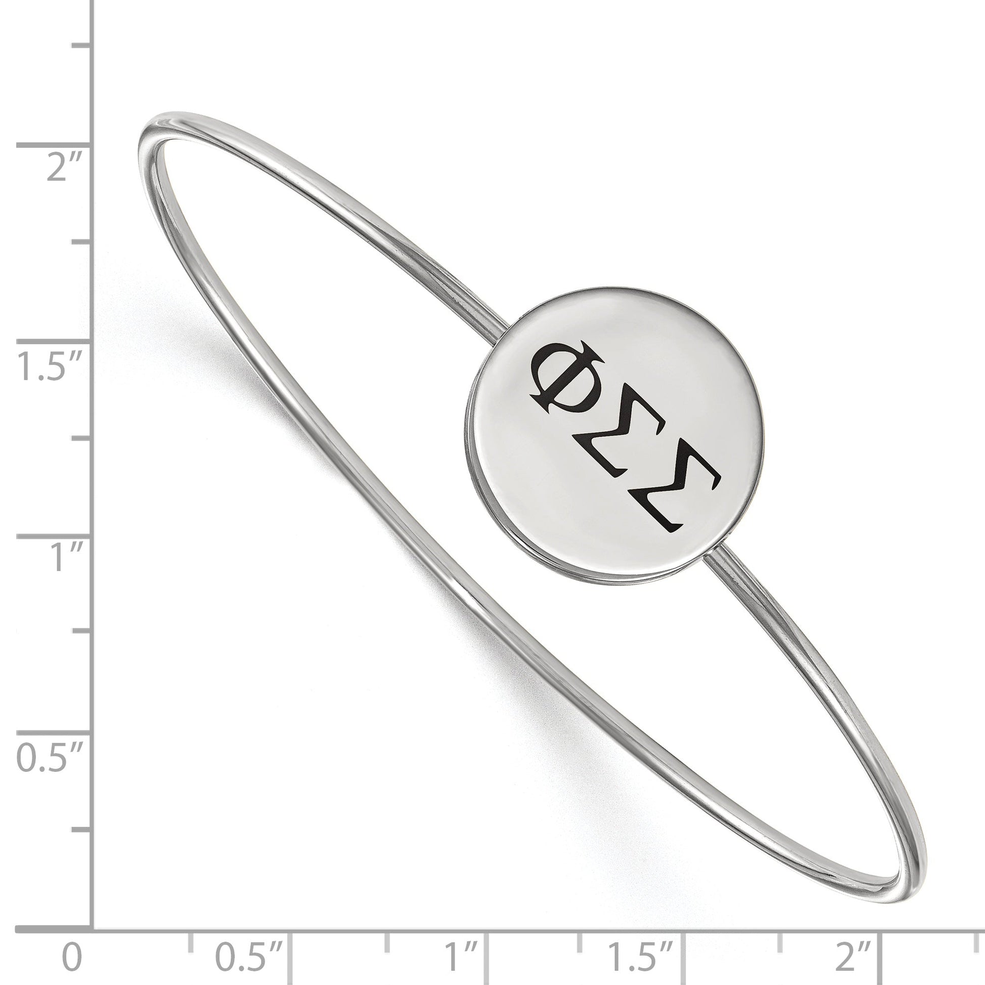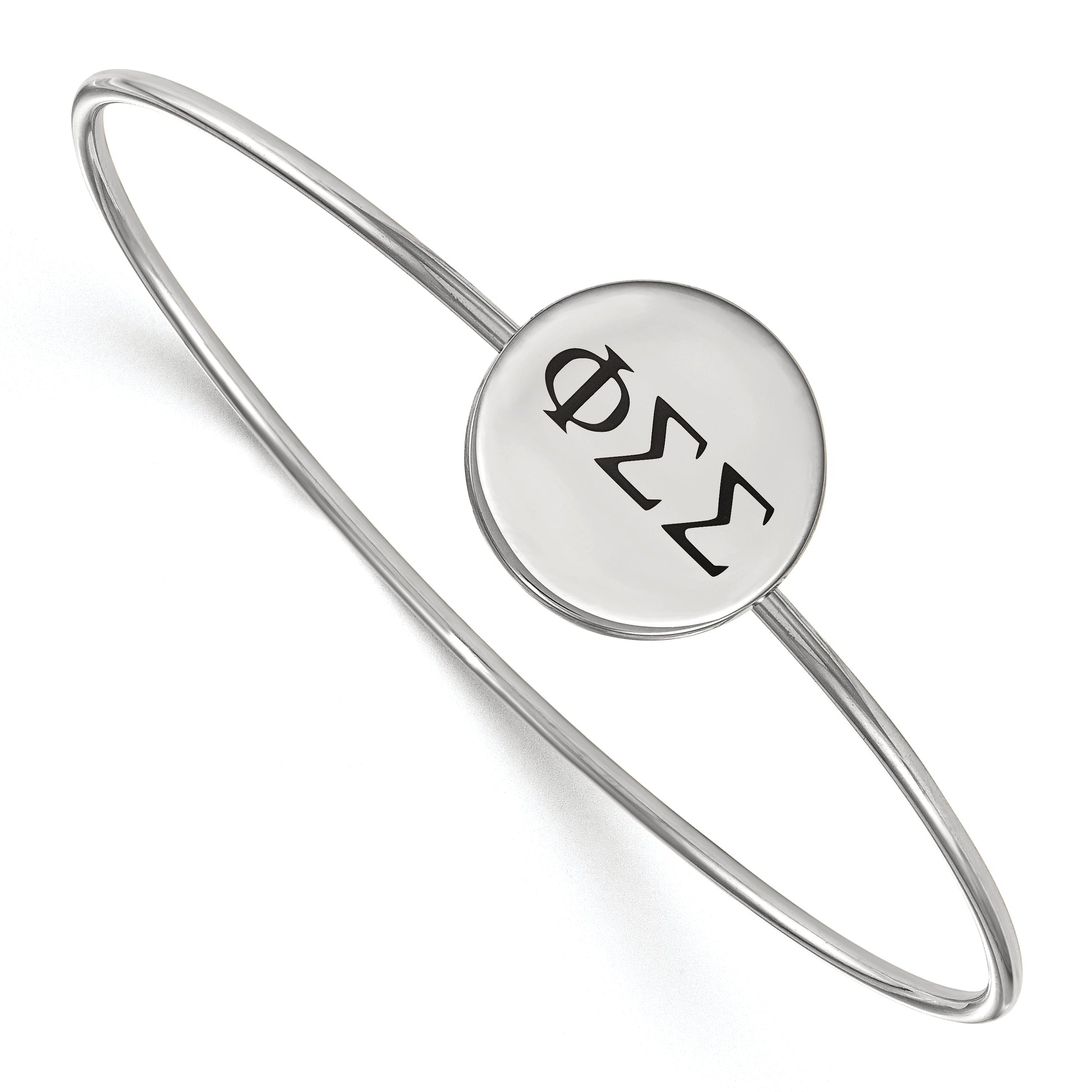 The Sterling Silver Rh-Plated Logoart Phi Sigma Enameled Slip-On Bangle is a sleek piece that embodies Greek pride. Crafted from high-quality sterling silver, it offers a polished finish with a bold black enamel logo at its center. The 7-inch slip-on design makes it easy to wear and remove, while its slim 2 mm width adds a subtle touch of elegance. This bangle is laser-cut for precision and features a rhodium plating to resist tarnish. Ideal for Phi Sigma Sigma sisters, the Logoart Phi Sigma Enameled slip-on bangle combines style and loyalty in a fine jewelry piece you'll love.