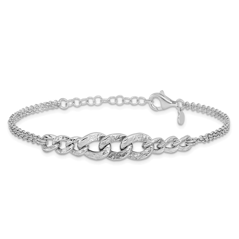 Meet the Sterling Silver Rhod-Pl Textured Link 2 Strand with 1-Inch Extender Bracelet, a sleek piece perfect for any woman’s jewelry collection. Crafted from high-quality 925 sterling silver with a shiny rhodium finish, its shiny textured links add a modern touch. The bracelet measures 8 inches long with a 7-inch chain and includes a 1-inch extender for a perfect fit. Its cable chain features a fancy lobster clasp for secure wear. Made with durable, machine-made quality, the Sterling Silver Rhod-Pl Textured Link 2 Strand Bracelet offers style and comfort in one eye-catching piece.