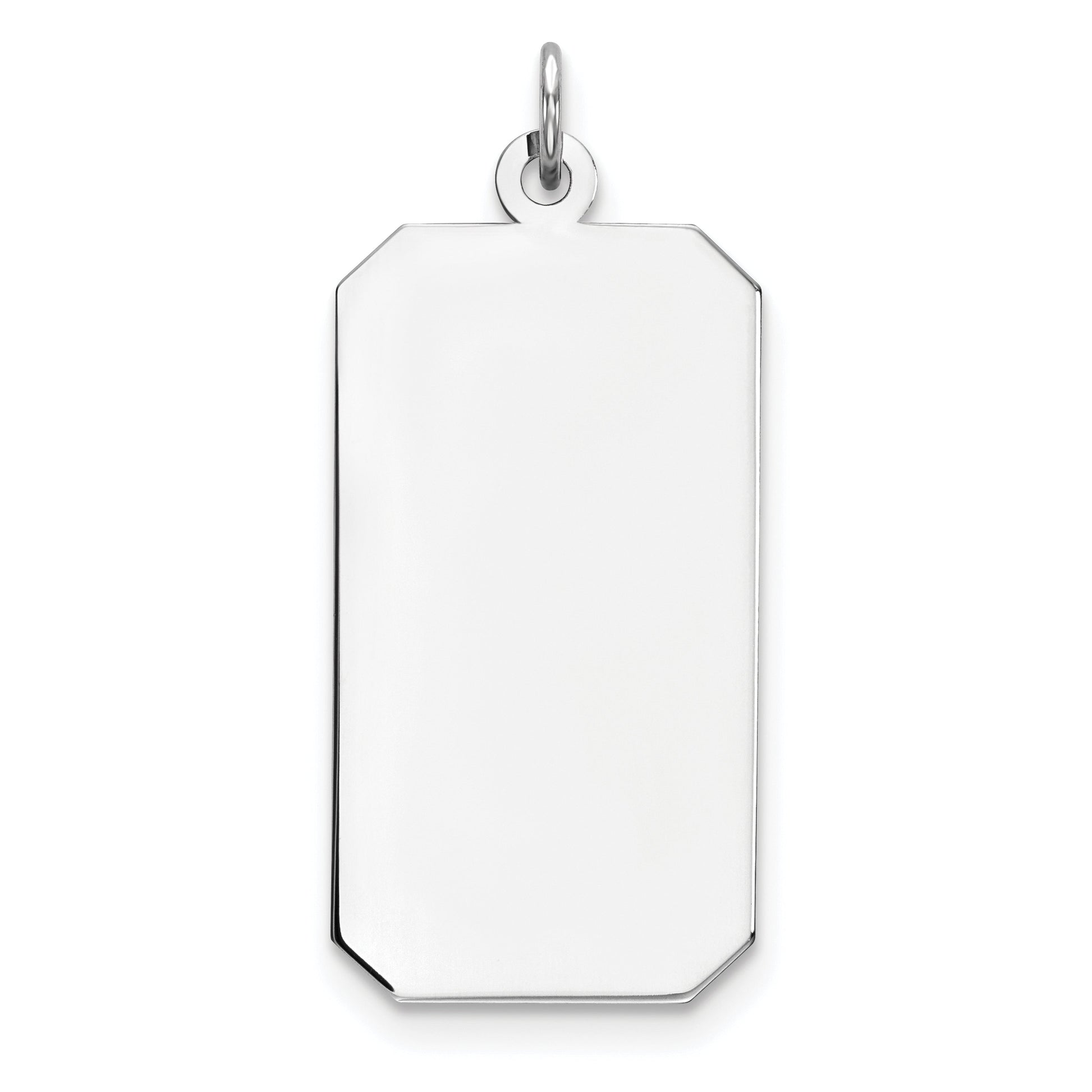 The Sterling Silver Rhodium-Plated Engravable Rectangle Pendant combines elegance with charm. Crafted from 925 sterling silver, this pendant features a polished front and a smooth satin back, providing a chic contrast. Its 32 mm length and 16 mm width make it a perfect accessory for any occasion. The solid, flat back design enhances its sturdiness while maintaining a sleek profile. This beautiful piece is rhodium-plated for added shine and resistance, ensuring lasting beauty. Personalize it with an engraving to create a special, one-of-a-kind necklace. The Sterling Silver Rhodium-Plated Engravable Rectangle Pendant is a timeless addition to any jewelry collection.