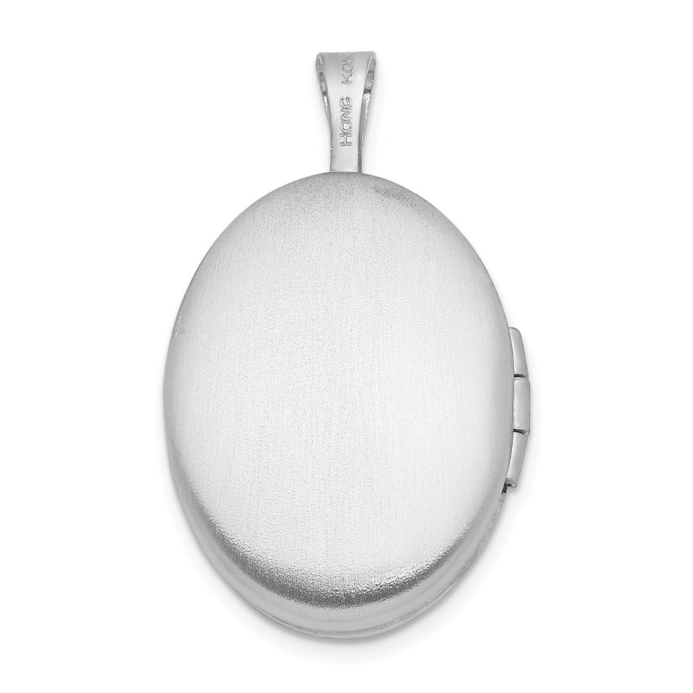 The Sterling Silver Rhodium-Plated Polished & Satin Leaf Border 19mm Oval Locket makes the perfect keepsake for your cherished memories. Crafted from high-quality 925 sterling silver, this elegant locket features stunning rhodium plating. Its polished and satin leaf border gives it a refined finish. With dimensions of 24.6mm by 15mm, it fits two 10x14mm photos. The die-struck manufacturing ensures durability, while the hollow feature keeps it lightweight. It opens easily, combining style and convenience. This charming piece is designed for women who appreciate both beauty and function. Cherish your most precious moments with this exquisite locket.