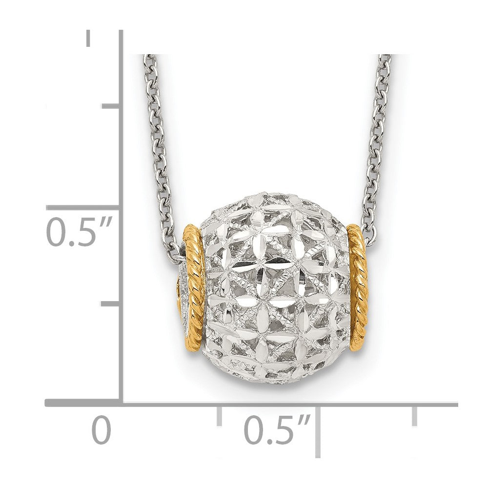 The Sterling Silver Rhodium-Plated with 14K Accent Spinner Barrel Pendant Necklace embodies graceful elegance. Made from sterling silver, this necklace boasts rhodium plating for a stunning silver tone that resists tarnish. A 14K gold accent adds a touch of luxe, making it a head-turner. Designed for women, the spinner barrel pendant captivates with its fancy style. It hangs from an 18-inch polished cable chain, secured by a fancy lobster clasp for ease and safety. Perfect for both day and evening wear, the Sterling Silver Rhodium-Plated with 14K Accent Spinner Barrel Pendant Necklace is a timeless addition to your collection.