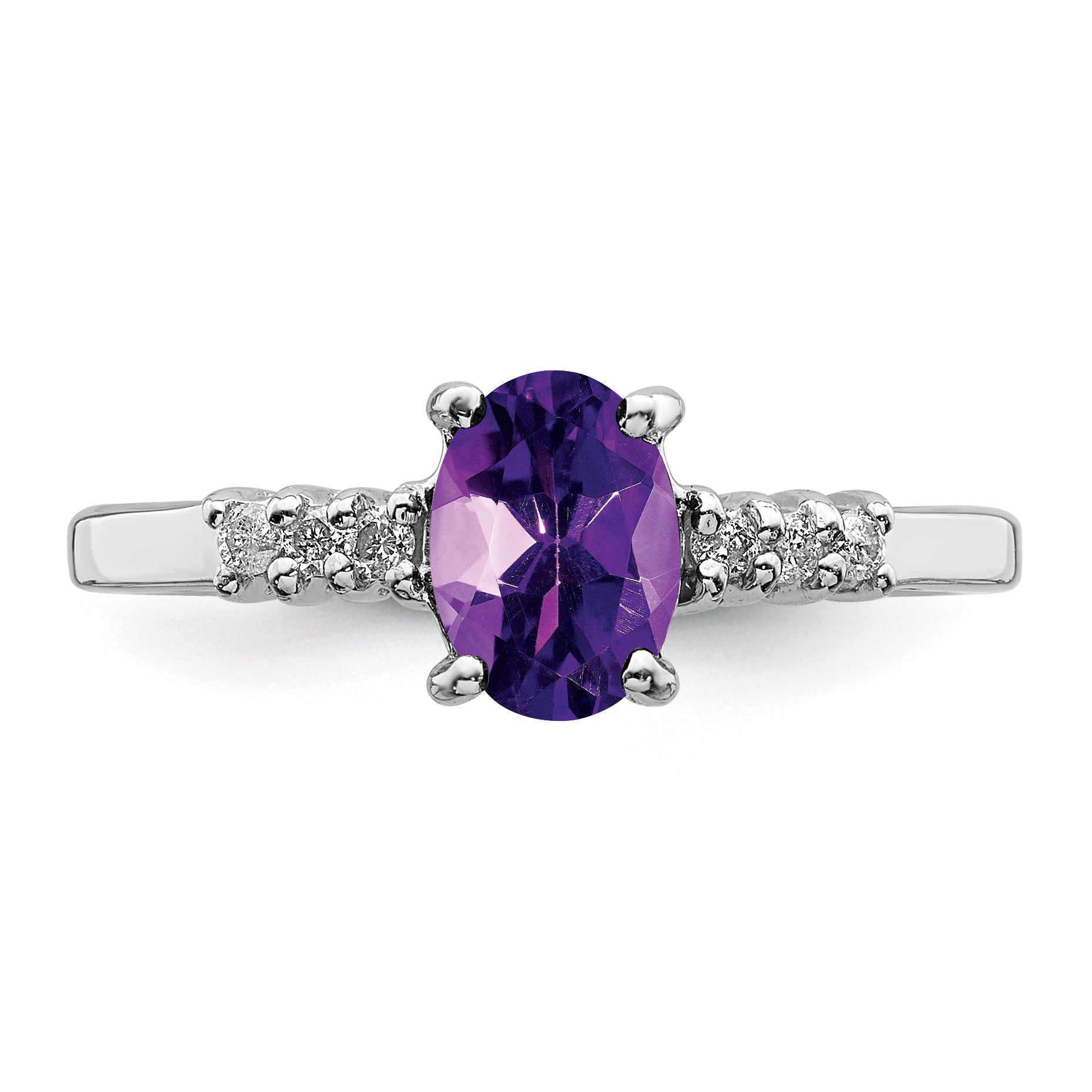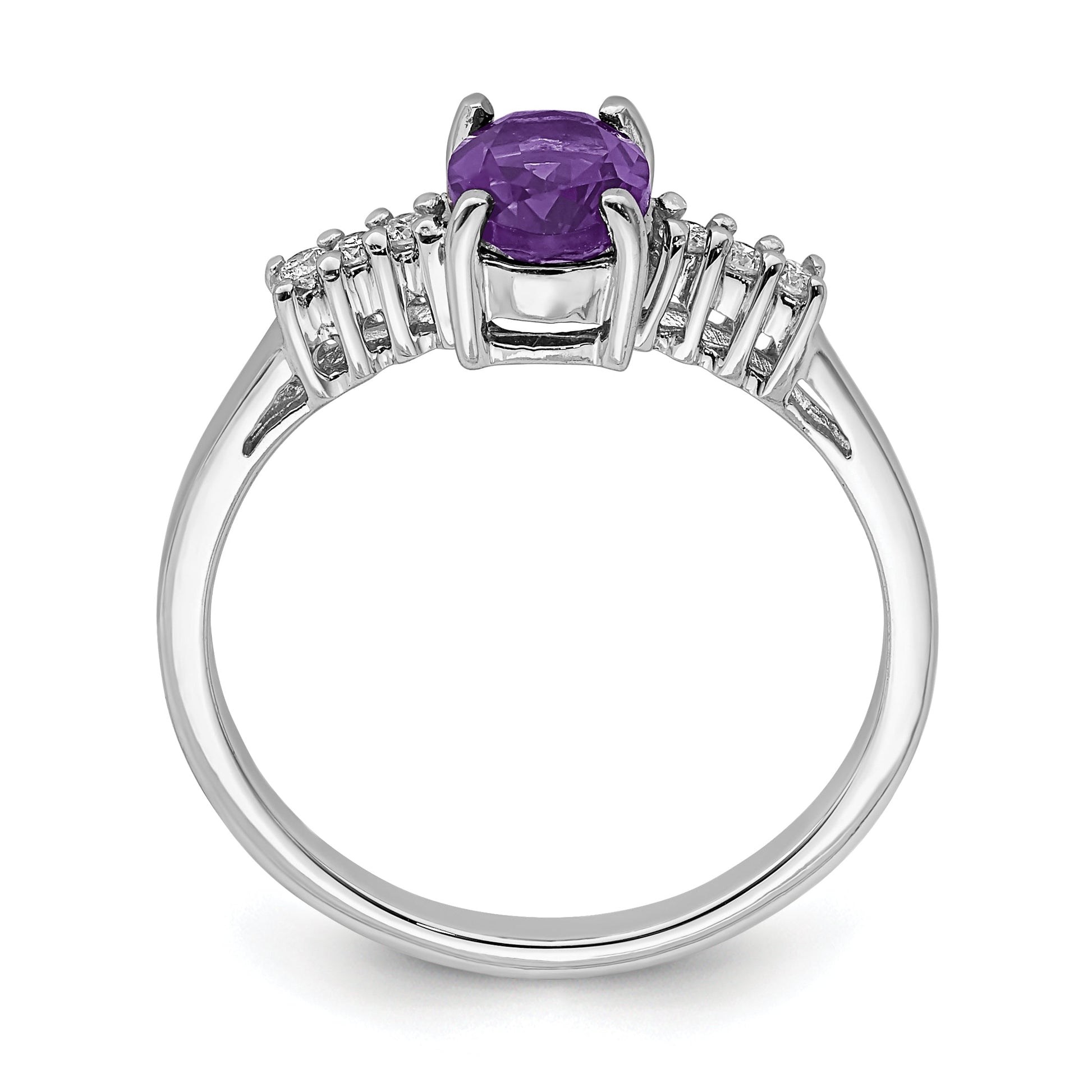 The Sterling Silver Rhodium Amethyst & Diamond Ring is a stunning piece that captures elegance and charm. Crafted from high-quality 925 sterling silver, this polished ring features a captivating purple amethyst as its centerpiece. The oval-shaped amethyst, measuring 7x5 mm and weighing 0.68 carats, is securely prong-set, radiating a vibrant hue that catches the eye. Complementing it are delicate diamonds, adding an extra 0.090 carats of sparkle. The slender 2 mm band ensures a comfortable fit, while the superb craftsmanship speaks of timeless beauty. Wear the Sterling Silver Rhodium Amethyst & Diamond Ring to elevate any outfit with its classic allure.