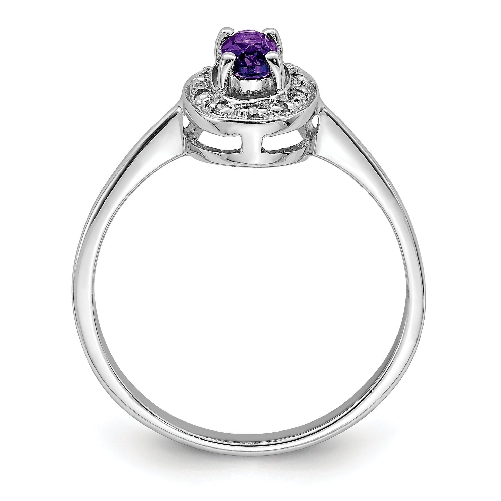 The Sterling Silver Rhodium Amethyst & Diamond Ring dazzles with its stunning beauty. Crafted from 925 sterling silver, this polished gem features a lush purple amethyst, perfectly oval and nestled in a secure bezel setting. Its captivating 0.2-carat brilliance complements the dainty 0.030-carat diamond accents, adding a touch of luxury. The band, only 2 mm wide, ensures a comfortable fit without compromising elegance. This solid piece, casted with precision, embodies grace and sophistication. A true ode to beauty, the Sterling Silver Rhodium Amethyst & Diamond Ring is a timeless treasure for any jewelry collection.