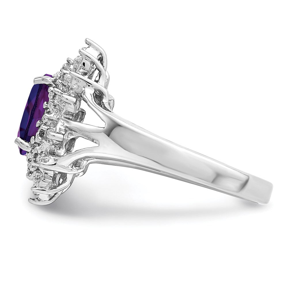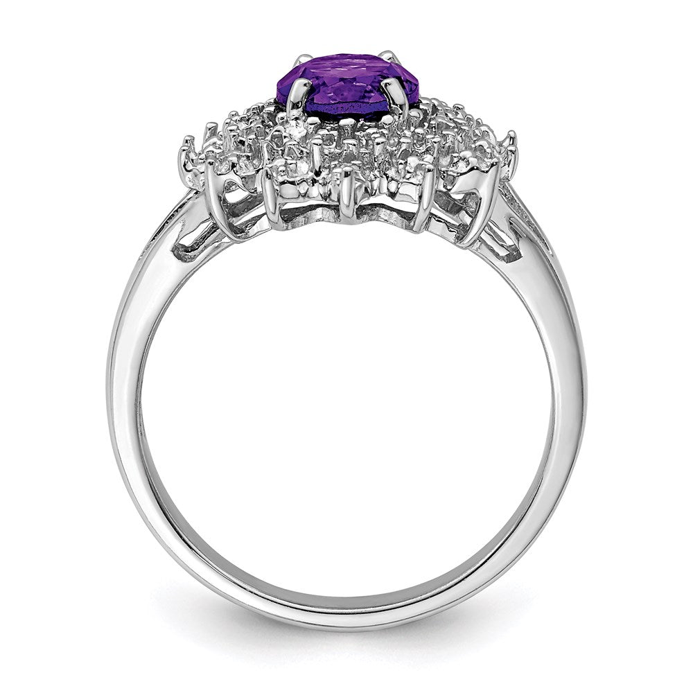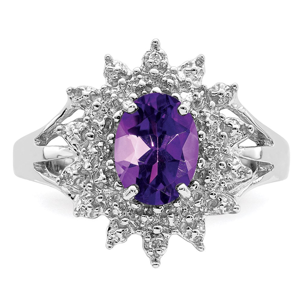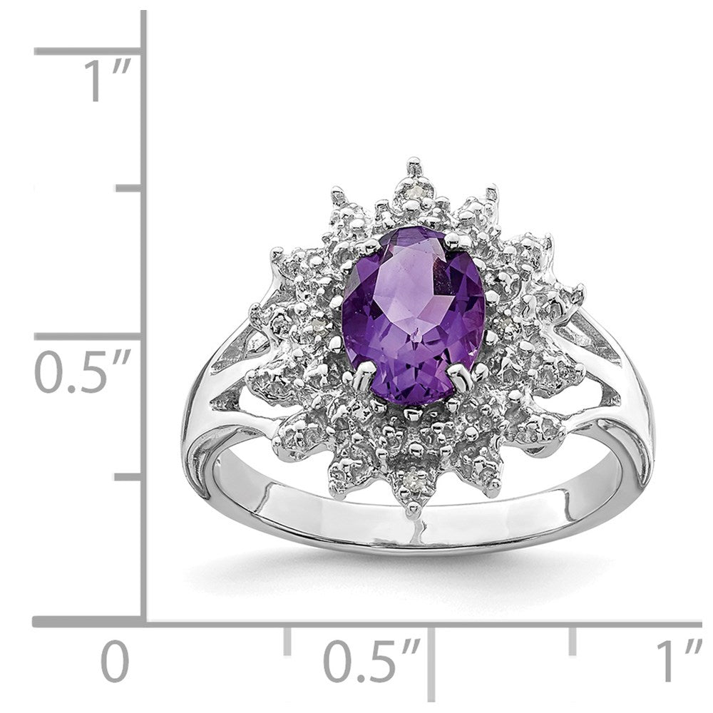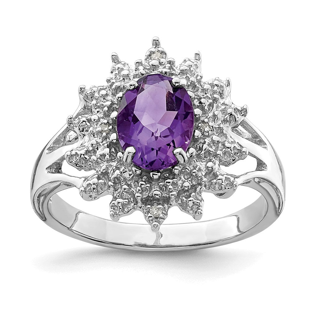 'Indulge in the luxurious charm of our 'Sterling Silver Rhodium Amethyst Diamond Ring'. Featuring a centerpiece Oval-cut 1.14 ct Amethyst, delicately prong-set and accented with natural Diamonds of 0.010 ct weight. Crafted from high-quality 925 Sterling Silver, casted to ensure durability, this ring guarantees to add a glamourous appeal to every outfit. The band width of 2mm and the exquisite white color beautifully complements the purple hues of the amethyst. The ring is perfect for all occasions, a statement piece that can be paired with any outfit. Each piece of this gemstone ring is carefully crafted to last long, making it a perfect addition to your jewelry collection. Get yours today and experience the unmatched elegance of the 'Sterling Silver Rhodium Amethyst Diamond Ring'.'