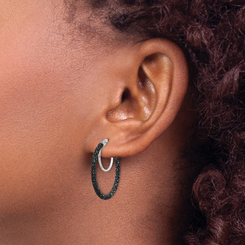 Introducing the Sterling Silver Rhodium Black Glitter Enamel Hoop Earrings—an elegant addition to any jewelry lover's collection. Crafted from high-quality 925 sterling silver, these hoops feature a striking black glitter enamel accent, offering a modern flair. The 26 mm length and 2 mm thickness make them a versatile accessory that complements any wardrobe. Finished with rhodium plating, these earrings resist tarnishing, ensuring lasting shine. The wire and clutch closure provide a secure and comfortable fit. Elevate your style with these Sterling Silver Rhodium Black Glitter Enamel Hoop Earrings, perfect for elevating day or night looks.