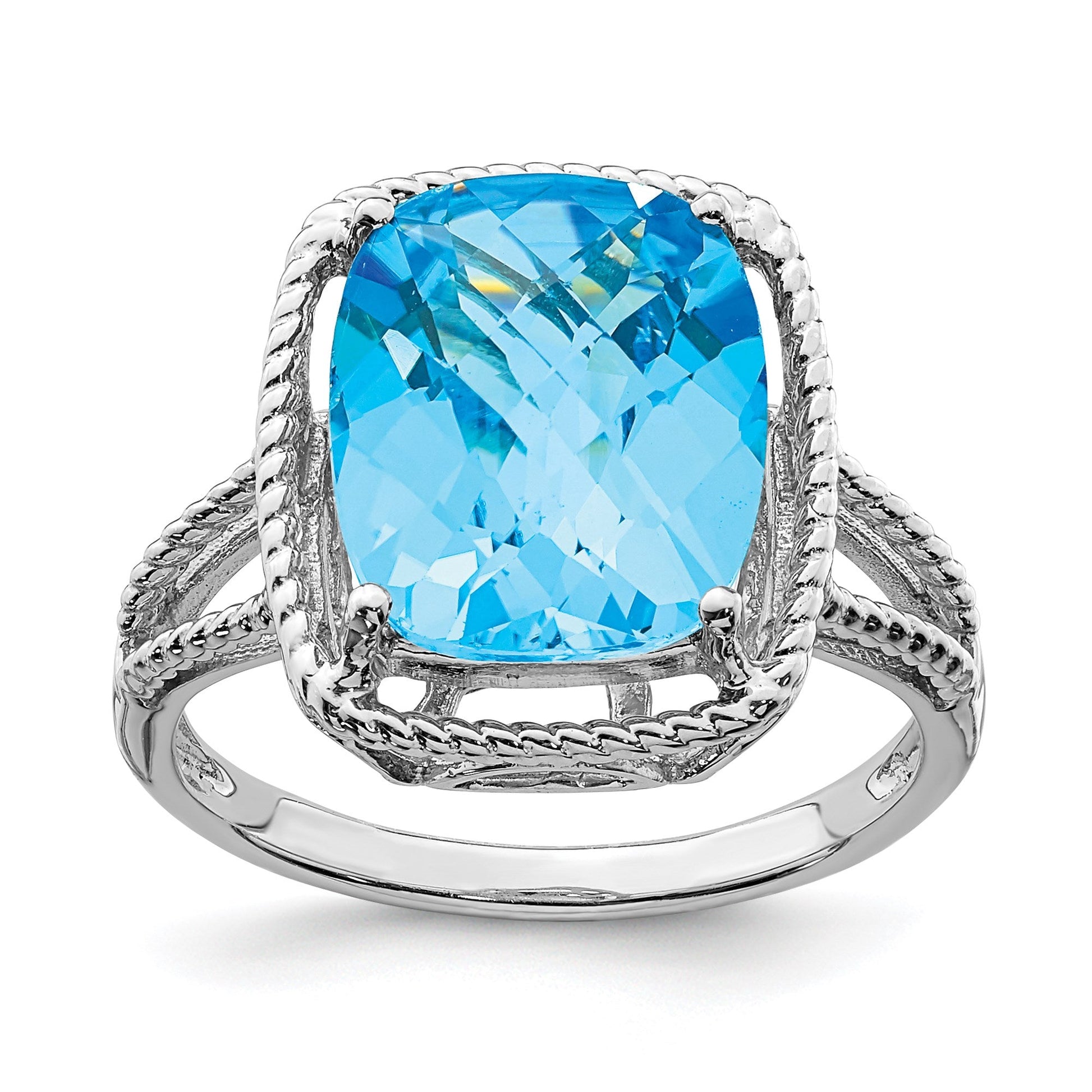 Sterling Silver Rhodium Checker-Cut Blue Topaz Gemstone Birthstone Ring Fine Jewelry Gift for Her