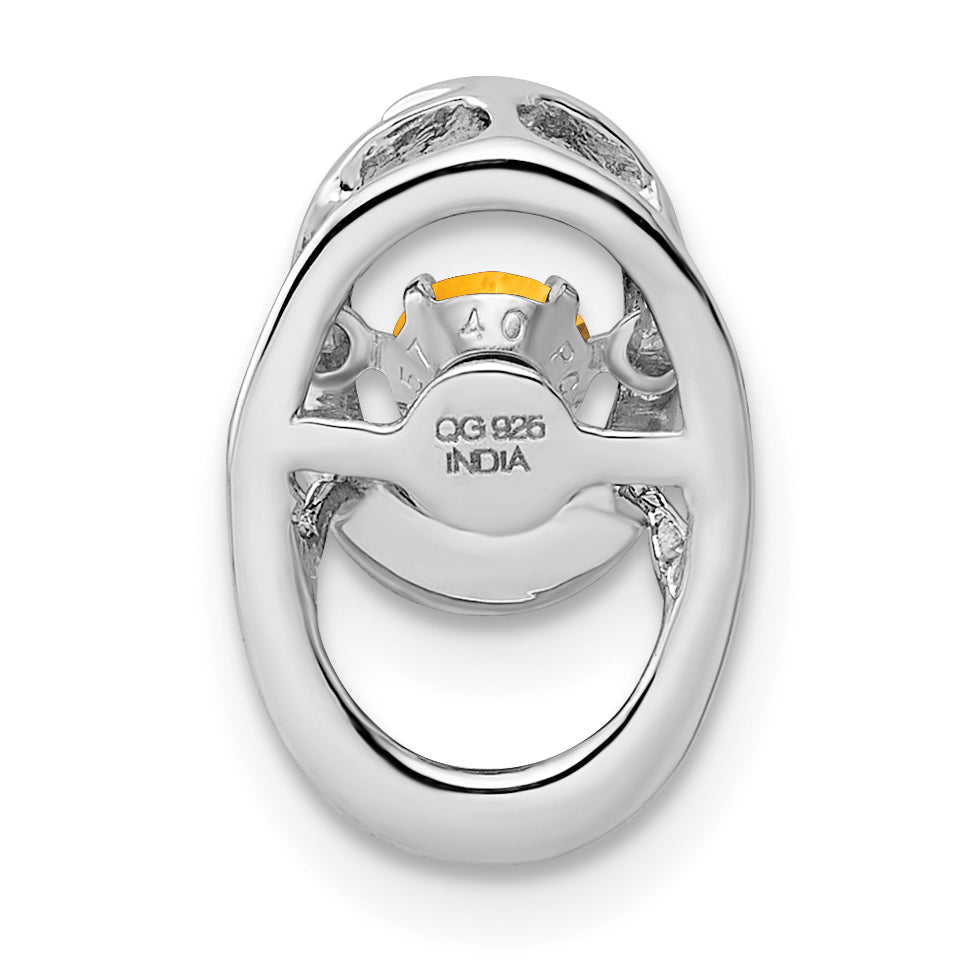 The Sterling Silver Rhodium Citrine Birthstone Vibrant Chain Slide exudes elegance. Crafted from 925 sterling silver, it's plated with rhodium for lasting shine. Its heart is a stunning natural citrine, the November birthstone, casting a warm yellow glow. This round gem weighs 0.26 carats and measures 3.7 mm, ensuring it stands out. A neatly polished finish enhances the piece’s allure. The pendant’s movable chain slide design adds a playful touch, while its 14.3 mm length and 9.75 mm width make it a perfect fit for daily wear. Embrace vibrant energy with this charming Sterling Silver Rhodium Citrine Birthstone Vibrant Chain Slide.