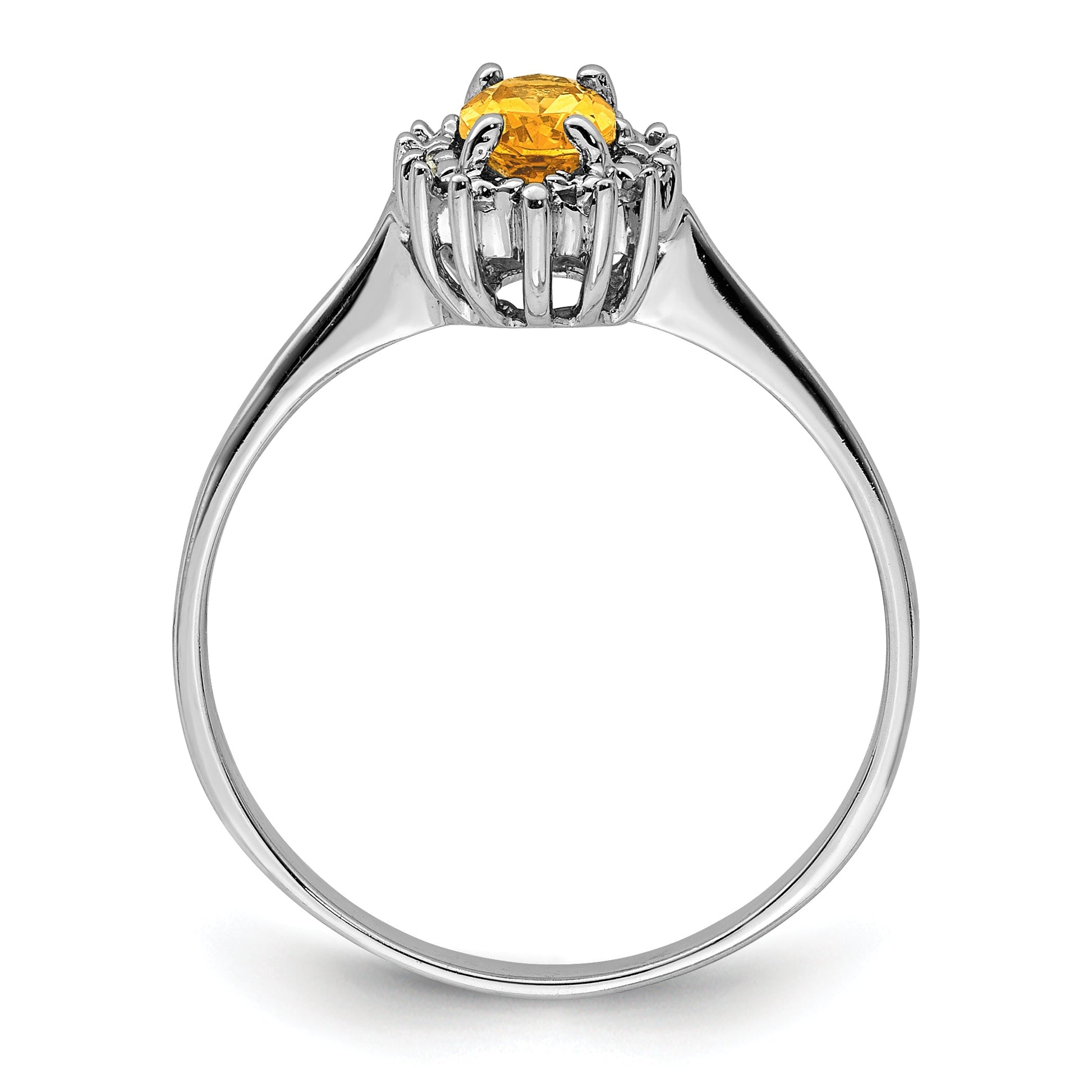 The Sterling Silver Rhodium Citrine Diamond Ring adds a splash of sunshine to your day. It boasts a captivating yellow citrine, prong-set within its polished sterling silver band. This bold oval gem measures 6x4 mm and weighs 0.37 carats, while the accent diamond adds a touch of sparkle. The band, sleek at 2 mm wide, gleams with rhodium plating, offering a luxurious finish. Crafted for women, this ring showcases the beauty of natural stones. The Sterling Silver Rhodium Citrine Diamond Ring is the perfect blend of elegance and charm.