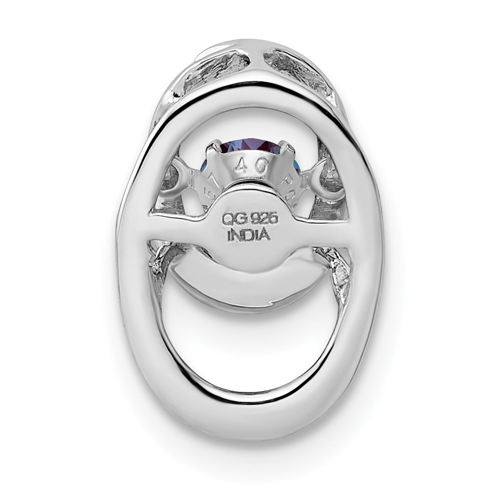 The Sterling Silver Rhodium Created Alexandrite Birthstone Vibrant Chain Slide beautifully celebrates June with its captivating design. Made from 925 sterling silver, this pendant showcases a shimmering lab-created Alexandrite, colored grey, nestled within a polished rhodium finish. This pendulum, slender yet solid, measures 14.5 mm in length and 9.6 mm wide, making it an elegant statement. The round Alexandrite stone inside, weighing 0.26 ct, is 3.7 mm in size and adds a touch of sophistication. Ideal for any birthstone collection, this piece ensures future heirloom value. Elevate your jewelry game with the Sterling Silver Rhodium Created Alexandrite Birthstone Vibrant Chain Slide.