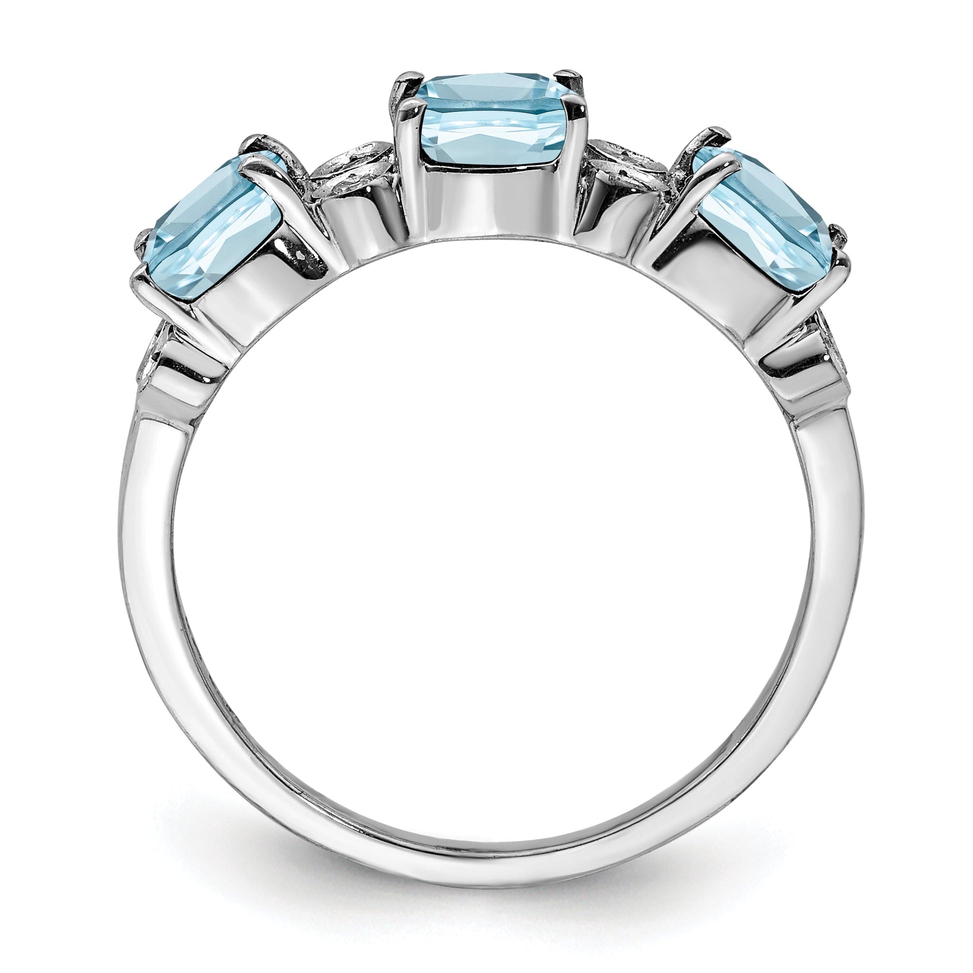 Introducing the Sterling Silver Rhodium Diam. & Sky Blue Topaz Ring, a stunning piece that blends elegance with a touch of sparkle. Crafted from high-purity 925 sterling silver, this ring features three vibrant sky blue topaz stones and dazzling diamonds that catch the light perfectly. Each cushion-shaped topaz is faceted for extra brilliance, while the rhodium plating adds a sleek, silver sheen and prevents tarnish. With a slender 2mm band, this ring offers a comfortable fit and stylish look. The Sky Blue Topaz ring makes a perfect gift, especially for December birthdays—it's a jewel that truly stands out and lasts.