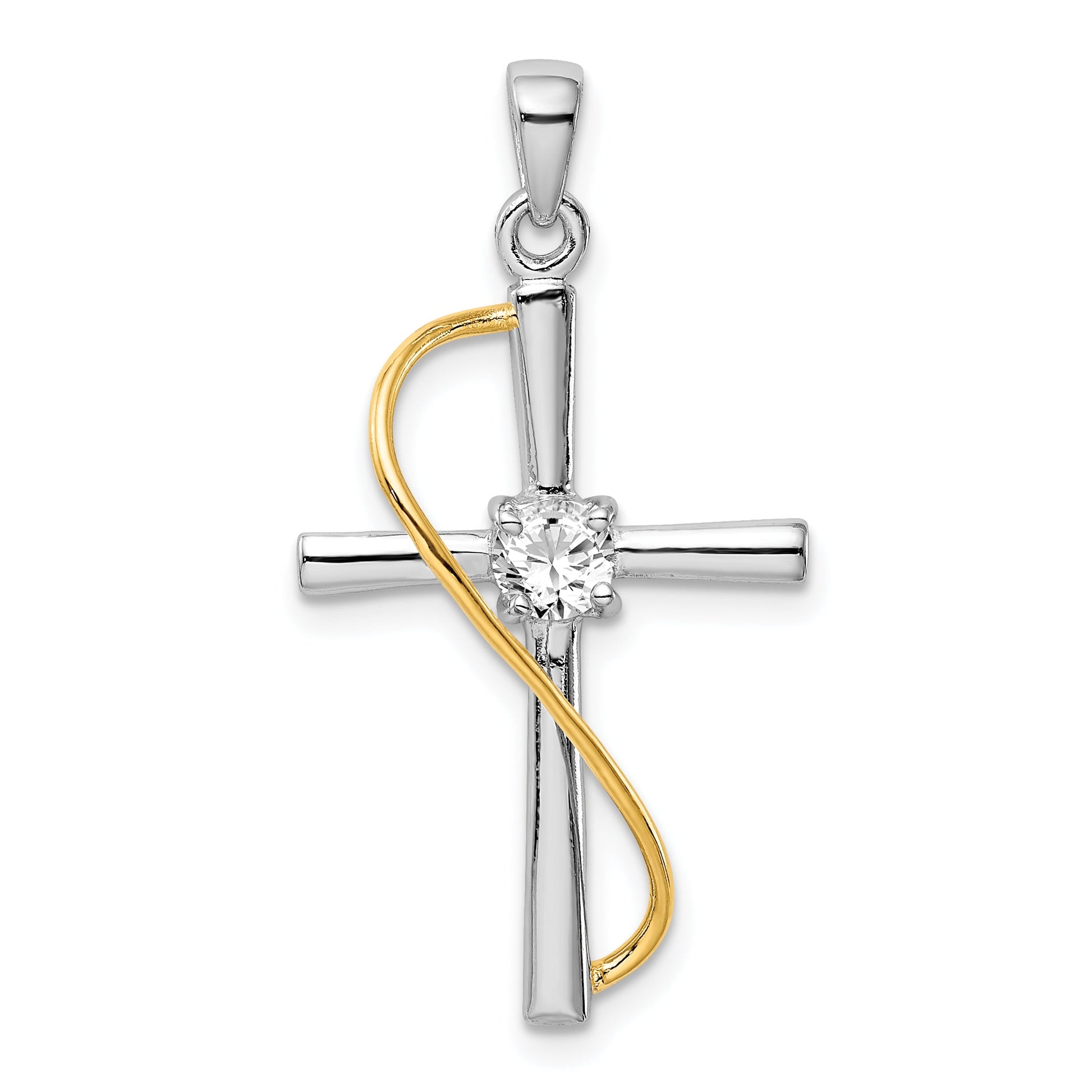 The Sterling Silver Rhodium & Gold-Tone Polished Cubic Zirconia Cross Pendant radiates elegance and sophistication. Crafted from 925 sterling silver and plated with rhodium for added sheen, this pendant boasts a shimmering synthetic cubic zirconia stone. Its gold-tone accents provide a touch of luxury. Measuring 28 mm in length, 17 mm in width, and 5 mm in thickness, this piece is both solid and durable thanks to its casted manufacturing process. Suitable for any occasion, the Sterling Silver Rhodium & Gold-Tone Polished Cubic Zirconia Cross Pendant is a must-have addition to your jewelry collection.