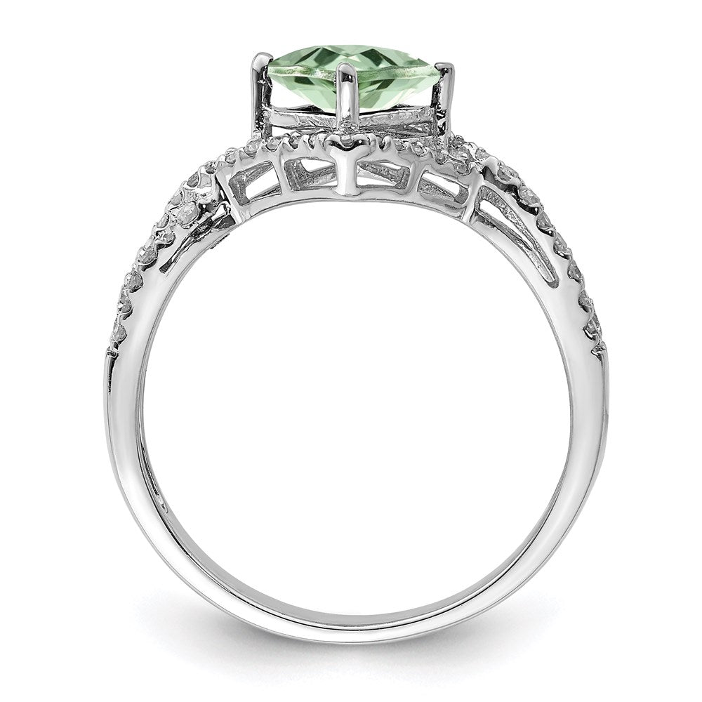 The Sterling Silver Rhodium Green Quartz & Diamond Ring is a stunning piece that stands out in any jewelry collection. Crafted from high-quality 925 sterling silver with a sleek rhodium finish, this ring showcases a beautiful square green quartz stone. The stone, heated for extra brilliance, weighs 0.55 carats and is cut in a princess style. Tiny sparkling diamonds totaling 0.250 carats highlight the green quartz, adding extra shimmer. With a slim 2 mm band, this ring offers a perfect fit and elegant look. The Sterling Silver Rhodium Green Quartz & Diamond Ring is a eye-catching gift or treat for yourself, blending natural beauty with fine craftsmanship.