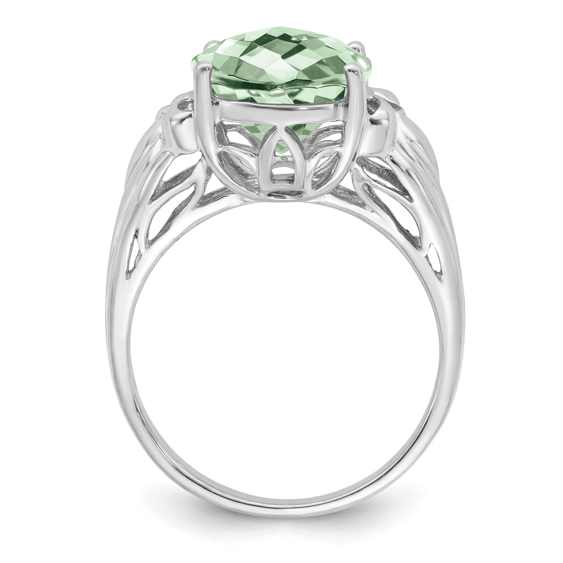 The Sterling Silver Rhodium Oval Checker-Cut Green Quartz Ring is a eye-catching piece that brings bold style to any look. Crafted from pure 925 sterling silver and finished with a shiny rhodium coat, this ring offers durability and a sleek silver tone. The 4.55-carat green quartz features a checkerboard cut that enhances its sparkle and depth. Measuring 12x10 mm, the oval-shaped stone is heat-treated for added beauty. This ring stands out with its vibrant glass-green hue and modern design, making it a perfect choice for those who love a touch of nature mixed with shiny elegance.
