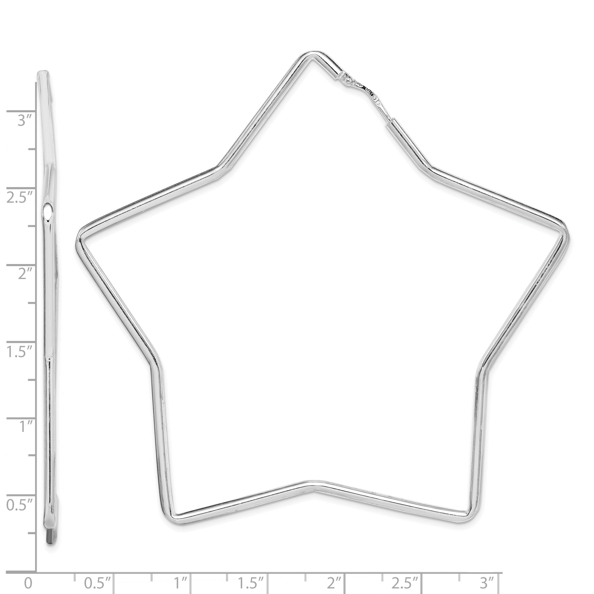The Sterling Silver Rhodium-Plated 2mm Star Hoop Earrings bring a touch of celestial charm to your look. Crafted from 925 sterling silver, these earrings offer both style and durability. With a polished finish and rhodium plating, they gleam with a bright, silver tone that complements any outfit. Measuring 78mm in length and 82mm in width, these hoops are fearless in size yet refined in style. The hidden wire and catch closure make them easy to wear while staying secure. Perfect for any woman who loves to make a statement, the Sterling Silver Rhodium-Plated 2mm Star Hoop Earrings are a must-have.