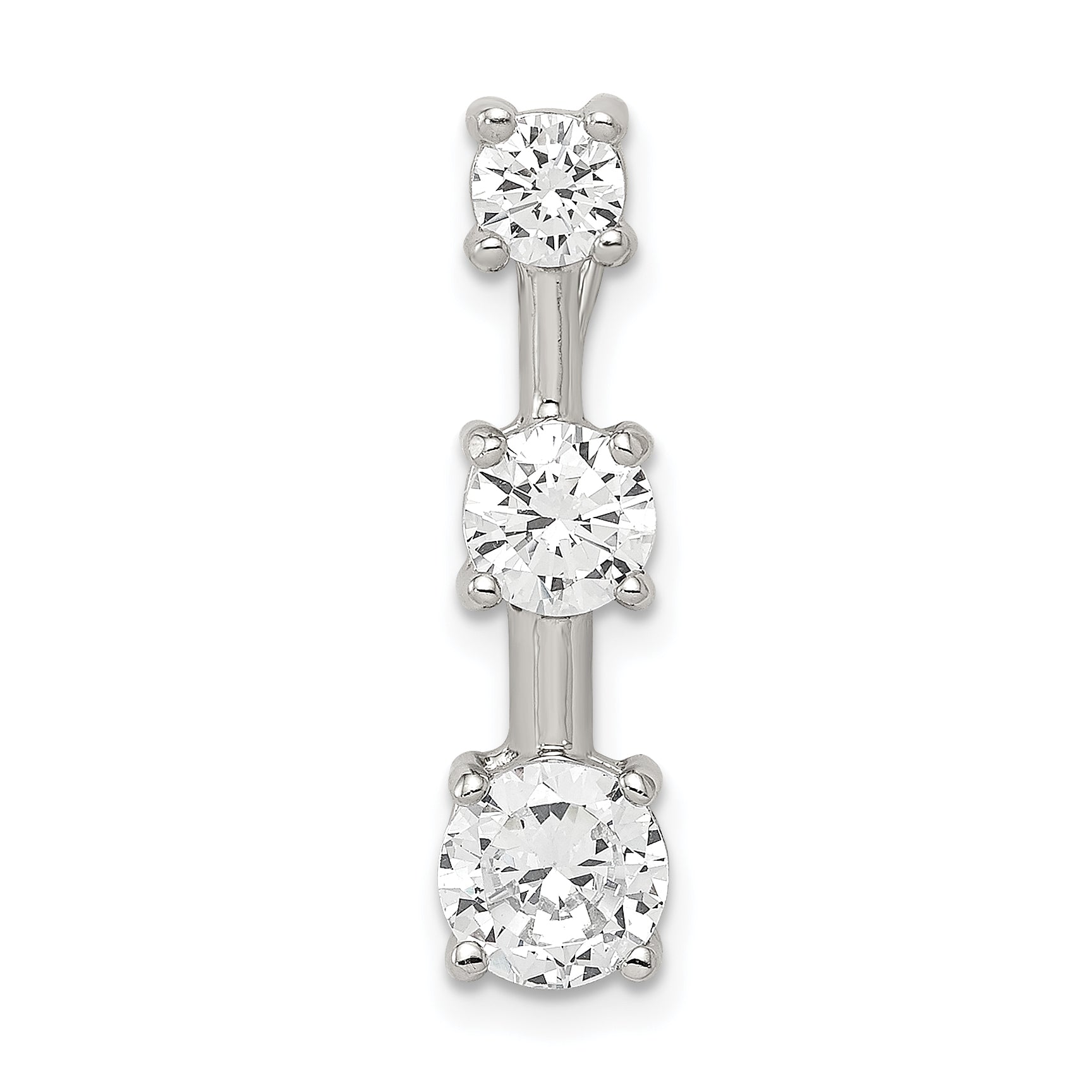 This Sterling Silver Rhodium-Plated 3-Stone CZ Pendant is an eyecatcher. Wrought from 925 sterling silver, it gleams with a polished rhodium finish. The pendant showcases three sparkling clear cubic zirconia stones, artfully set to dazzle any onlooker. Each stone, precisely crafted and synthetic, adds an aura of grace, mimicking the brilliance of genuine diamonds. Measuring 24mm in length and 6mm in width, its sleek design offers a touch of elegance to any outfit. Wear this Sterling Silver Rhodium-Plated 3-Stone CZ Pendant as a must-have style statement.