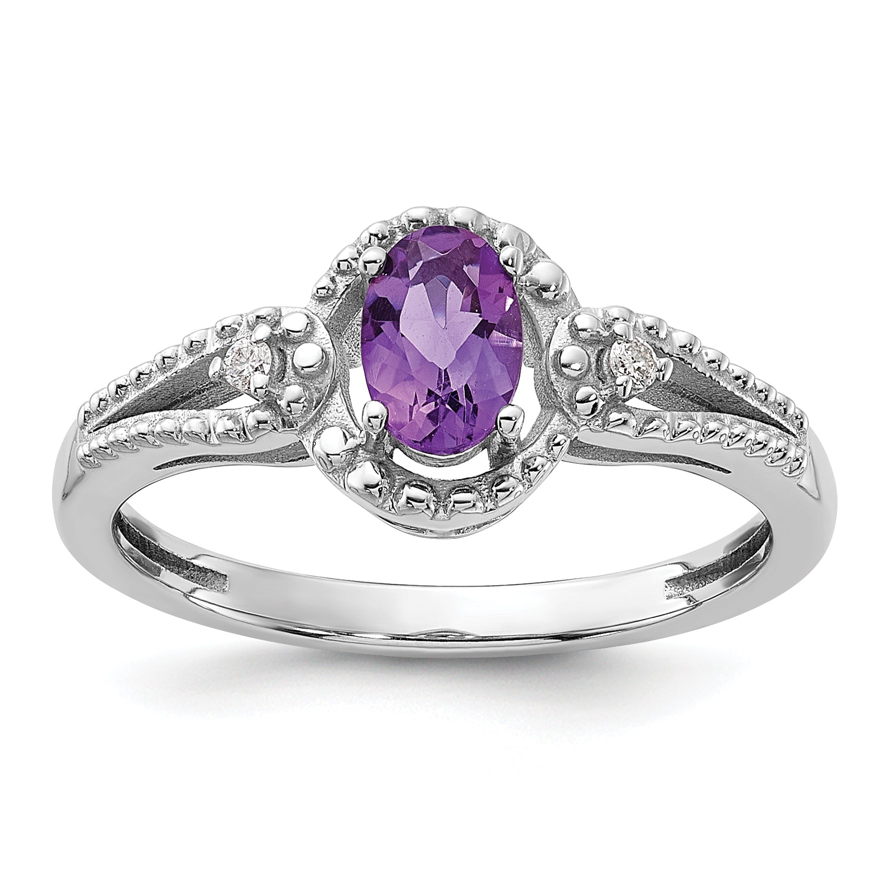 The Sterling Silver Rhodium-Plated Amethyst & Diamond Ring exudes elegance with its stunning design and craftsmanship. Crafted from 925 sterling silver, this exquisite ring features a natural oval amethyst, prong-set at the center, exuding a rich purple hue that captivates the eye. Complementing this are two round natural diamonds, adding sparkle and allure. The rhodium plating enhances durability, ensuring a lasting shine. Casted with precision, the slender 2 mm band offers a comfortable fit. This gemstone beauty, with its February birthstone significance, makes a perfect gift or a cherished addition to any jewelry ensemble.