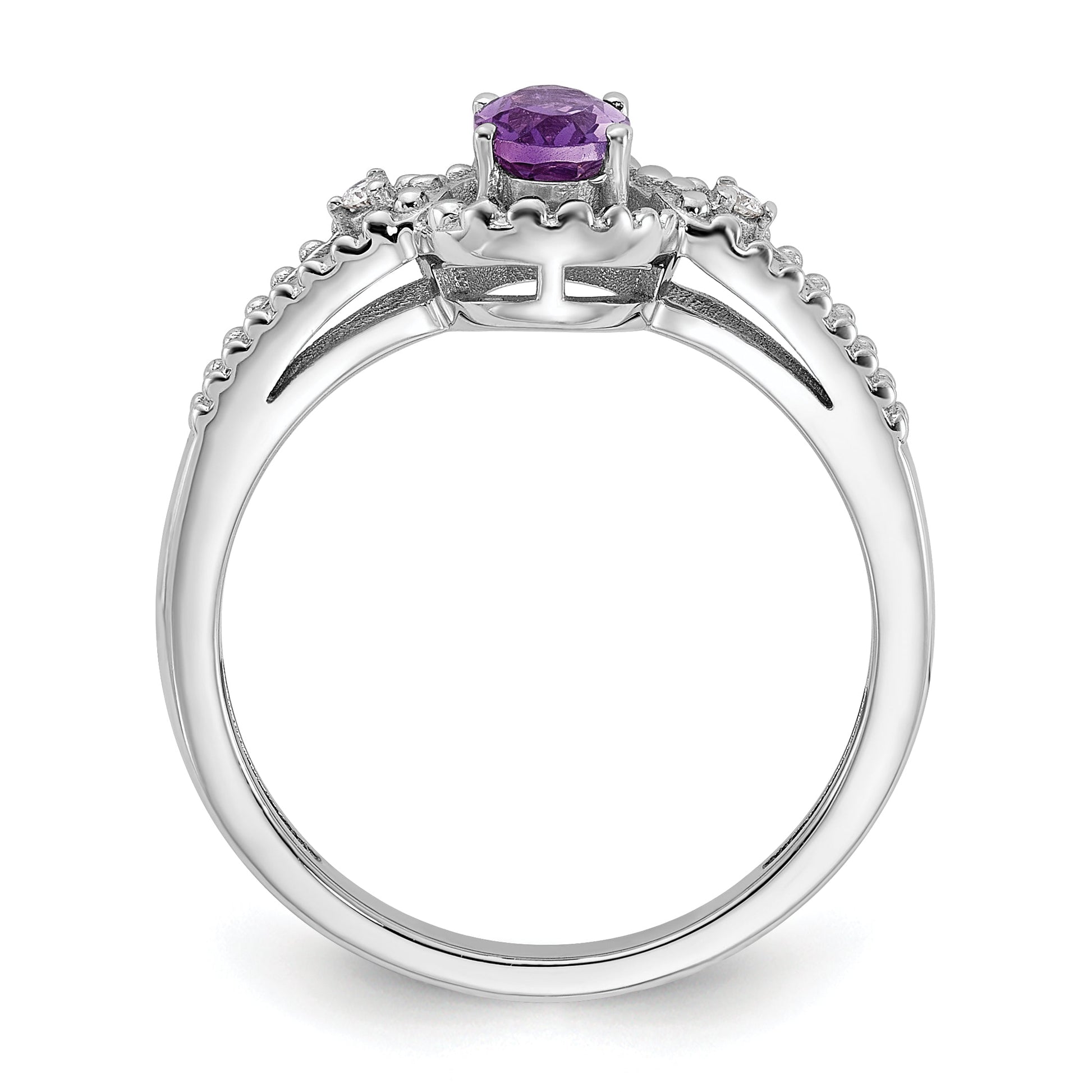 Indulge in elegance with the Sterling Silver Rhodium-Plated Amethyst & Diamond Ring. This stunning piece shines with a vibrant purple amethyst framed by two sparkling diamonds, both prong set for security. The rich oval-shaped amethyst weighs 0.42 carat, pairing beautifully with the delicate round diamonds totaling 0.02 carats. Crafted from high-quality 925 sterling silver, this ring features a rhodium plating that enhances its shine and resistance to tarnish. Its 2 mm band provides a comfortable fit without compromising style. Celebrate February birthdays or simply add a dash of color with this sophisticated Sterling Silver Rhodium-Plated Amethyst & Diam. Ring.