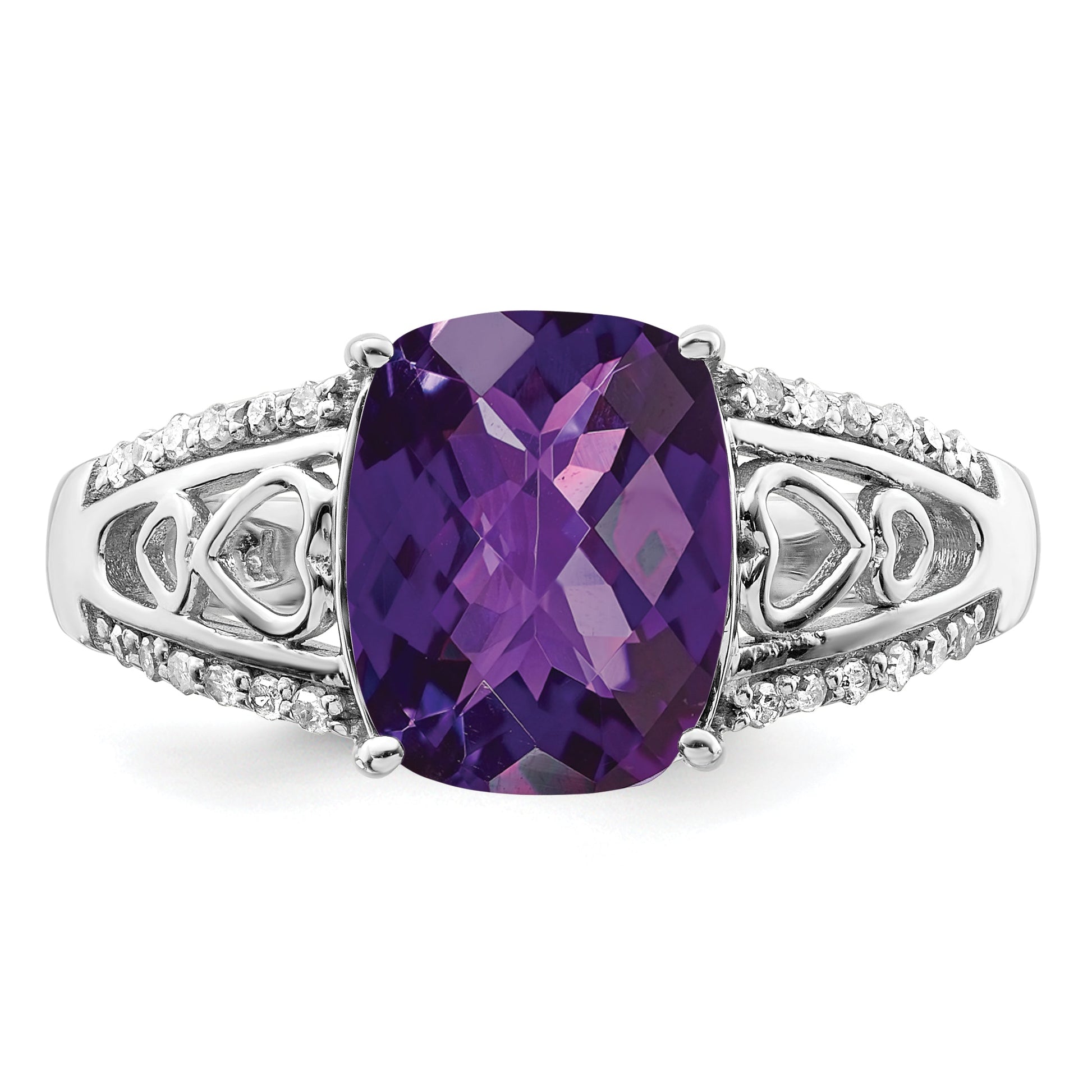 The Sterling Silver Rhodium-Plated Amethyst & Diamond Ring is a stunning piece that blends elegance with style. Crafted from 925 sterling silver and coated in shiny rhodium, this ring features a beautiful 10x8 mm cushion-cut amethyst. The purple stone, heated for extra sparkle, weighs 2.75 carats and sits proudly alongside a top-quality diamond. Designed for comfort, its 2 mm band fits snugly. Perfect for February birthdays or anyone who loves bold, sparkling jewelry, the Sterling Silver Rhodium-Plated Amethyst & Diamond Ring makes a striking addition to any collection.