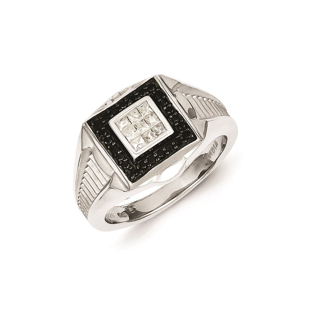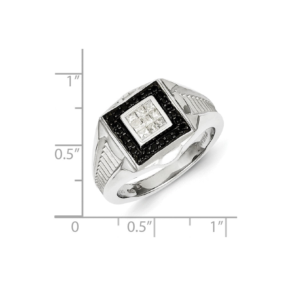 This men's ring is made of high quality sterling silver and is rhodium plated for a stunning white finish. The design features 9 square natural white diamonds and 24 round natural black diamonds, totaling 0.0300 ct and 0.0096 ct respectively. The diamonds are carefully arranged in a stylish pattern, and are sure to catch the eye. This ring is perfect for any occasion, and makes an excellent addition to any jewelry collection.
