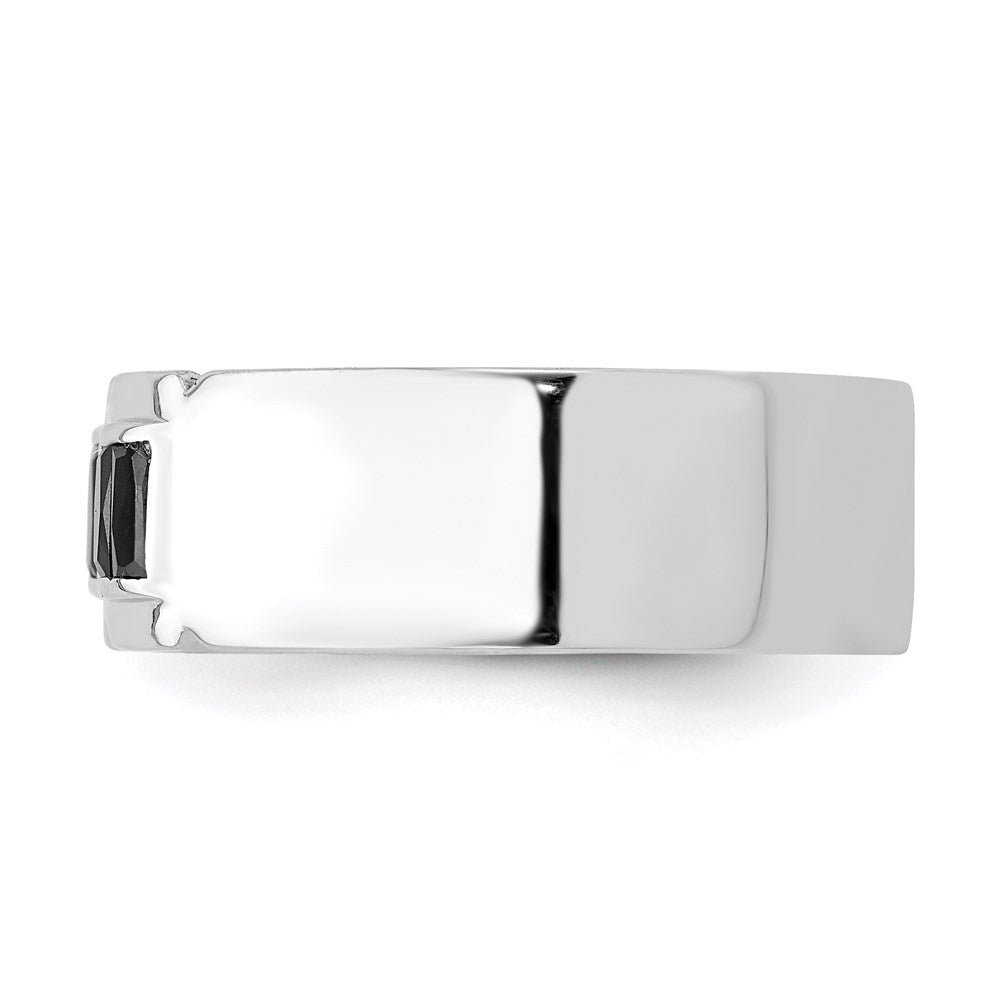 The Sterling Silver Rhodium-Plated Black CZ Grooved Ring is the perfect piece to add some edge to any look. Crafted from solid 925 sterling silver, this ring sports a sleek silver tone that catches the eye. It features nine channel-set black cubic zirconia stones, each shaped as a baguette, and arranged in a stylish grooved band just 6.4 mm wide. The piece boasts a durable rhodium finish, ensuring it stays shiny and resistant to tarnish. With its rugged yet classy design, the Sterling Silver Rhodium-Plated Black CZ Grooved Ring makes a bold statement for any man who wants to stand out.