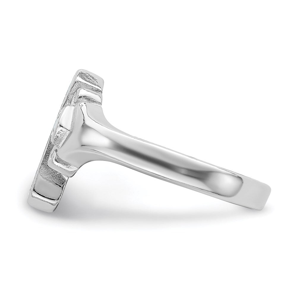The Sterling Silver Rhodium-Plated Blue Inlay Created Opal Cross Ring is a sleek piece that adds style to any look. Crafted from shiny sterling silver, this ring features a bold cross design with a striking blue opal inlay. The lab-created opal shows colorful flashes that catch the eye. Its smooth rounded edges and polished finish give it a modern vibe. With a ring top measuring 11.4 mm by 13.6 mm and a band only 2.4 mm wide, this piece offers a comfortable fit. The Sterling Silver Rhodium-Plated Blue Inlay Created Opal Cross Ring is perfect for anyone who loves meaningful jewelry with a fresh twist.