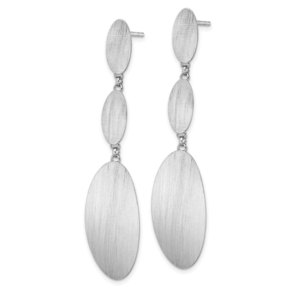 Meet elegance with our Sterling Silver Rhodium-Plated Brushed Dangle Post Earrings. These stunning pieces are crafted from high-quality 925 sterling silver, ensuring both durability and charm. Each earring showcases a rhodium-plated, brushed satin finish, offering a sleek and sophisticated look. Measuring 57mm in length and 13.7mm in width, they make a bold yet refined statement. These drop-style earrings feature secure post and push-back clasps, making them perfect for daily wear. Add these Sterling Silver Rhodium-Plated Brushed Dangle Post Earrings to your collection for a timeless addition that shines with a silver tone.