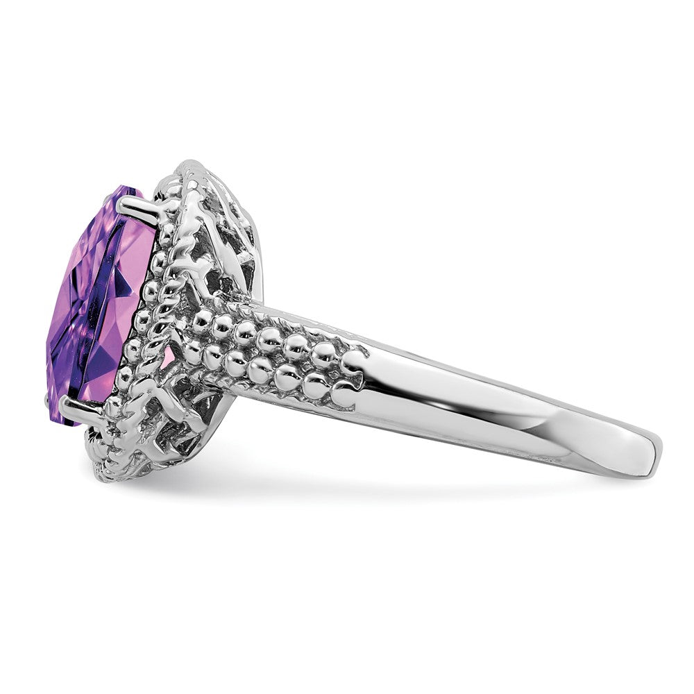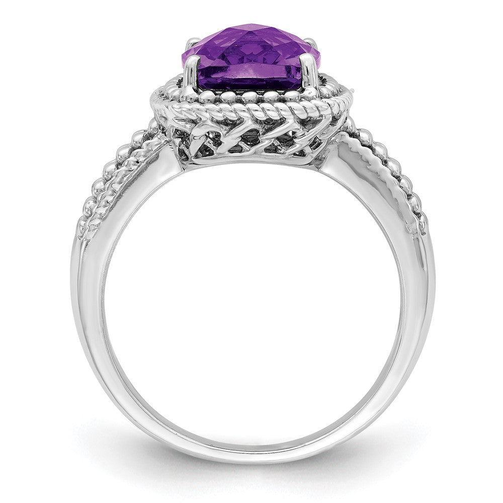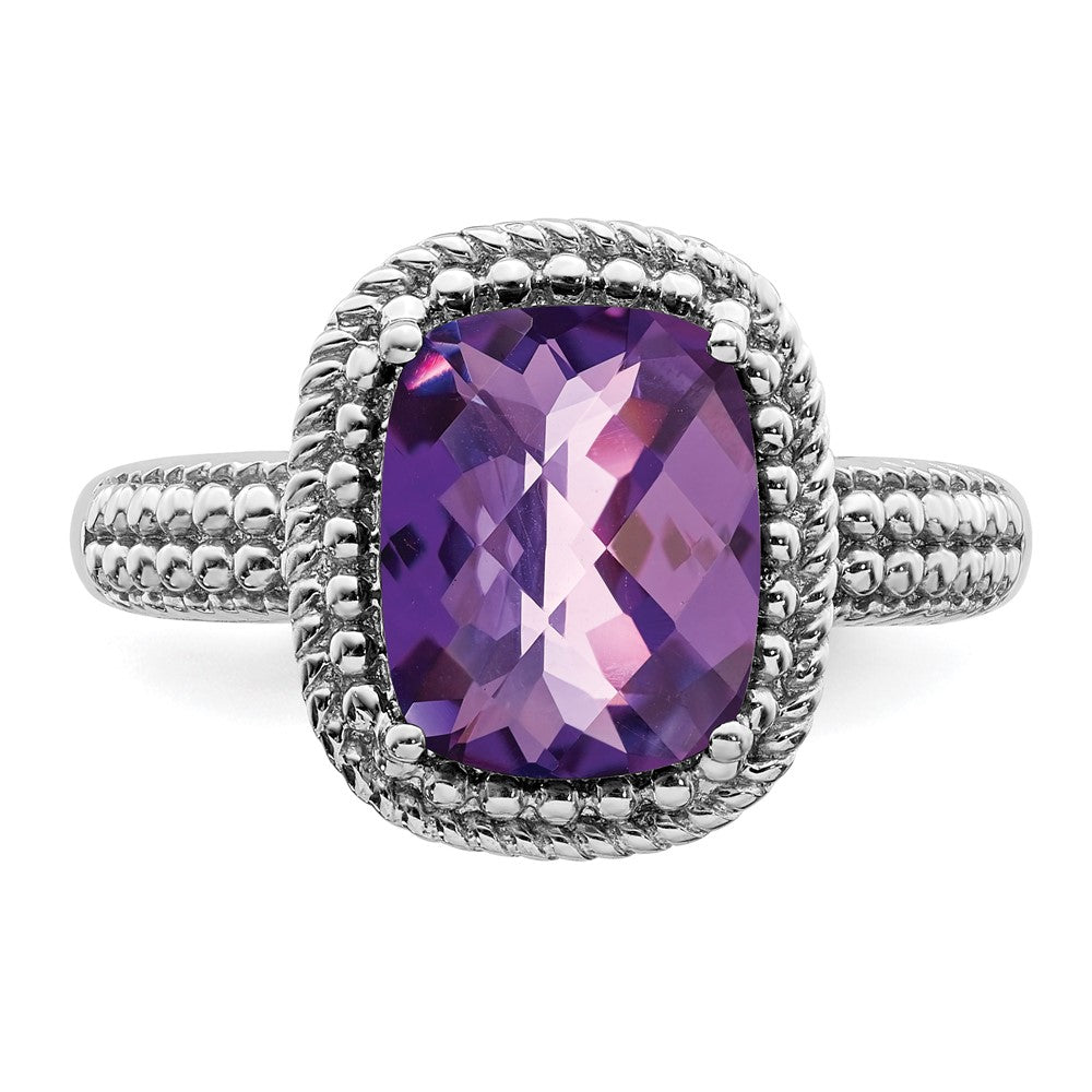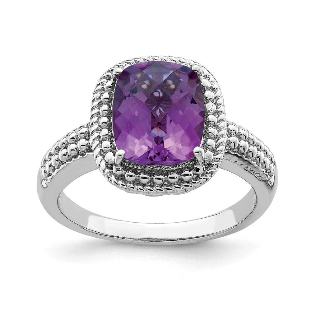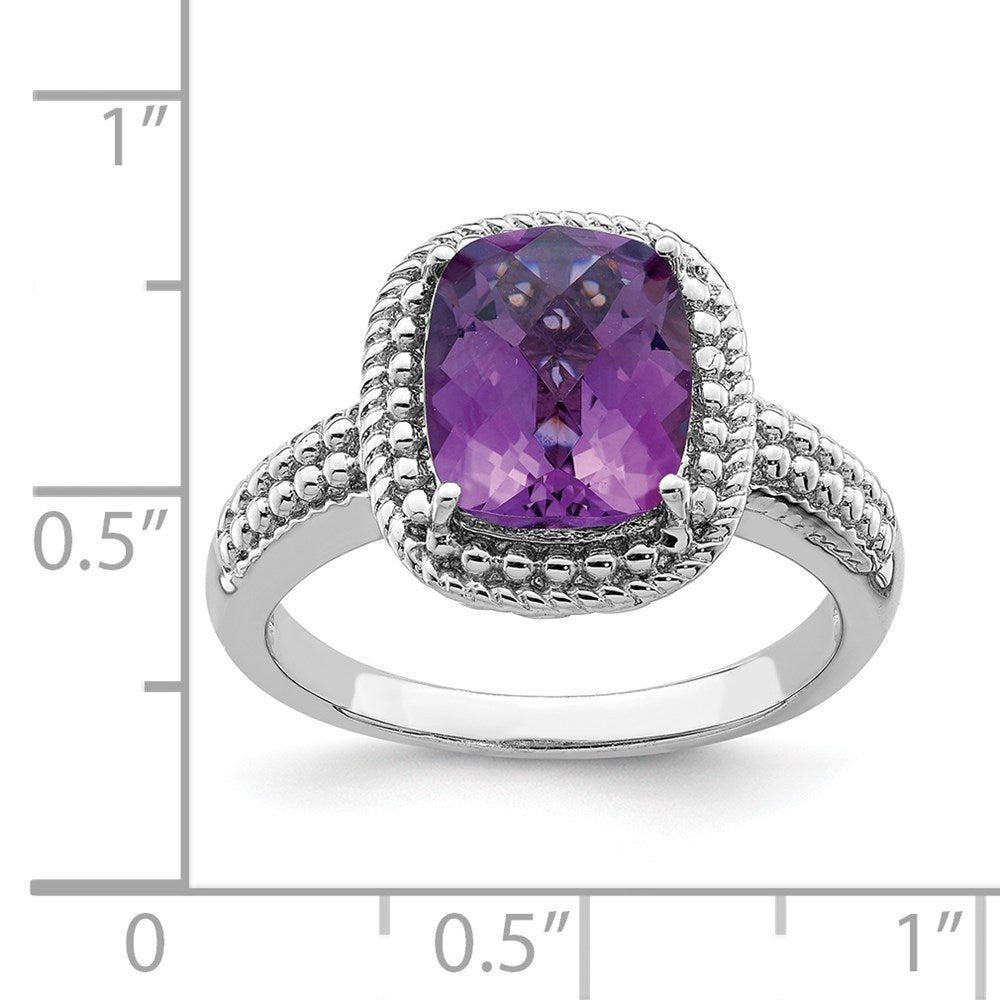 This beautiful piece of jewelry is a Sterling Silver Rhodium-plated Checker-Cut Amethyst Ring. The stone used is a cushion-cut amethyst, which measures 10.00 x 8.00 mm in size and weighs 2.550 ct. The stone is a natural product which has undergone heating treatment. The ring is polished to offer a smooth and lustrous finish, with a band width of 2 mm. The clarity of the stone is of superior quality, with an AA rating, and boasts an attractive purple color. The rhodium plating ensures the ring remains tarnish-proof and long-lasting. This ring is designed for women and is complete with all stones. It is a perfect gift for those born in February, the month of the amethyst birthstone.
