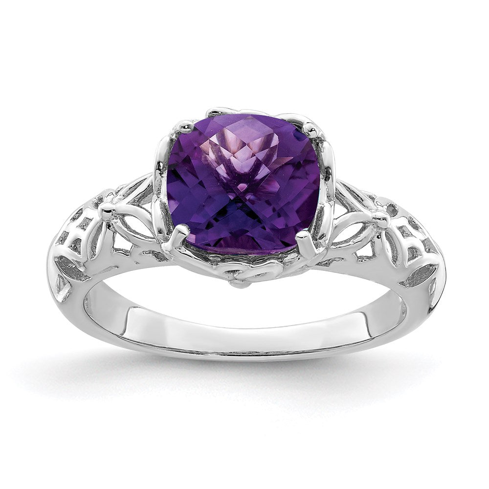 This is a ring made of sterling silver and plated with rhodium. It has a large purple amethyst stone that has been cut in a cushion shape and a checkerboard pattern. The stone is 8mm in size and weighs 2.20 carats. The band of the ring is 2mm wide. The ring is a piece of jewelry and is meant to be worn on the finger. The amethyst is a natural stone and is the birthstone of February.