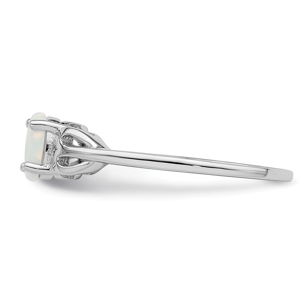 The Sterling Silver Rhodium-Plated Created Opal Ring offers a stunning blend of elegance and beauty for any occasion. Crafted from 925 sterling silver, this polished ring features a mesmerizing lab-created opal that captures the eye with its distinctive phenomena color. The stone is prong set, showcasing its oval shape and precise 6 x 4 mm size. With a band width of 2 mm, this piece offers both comfort and style. The rhodium plating adds a silver tone that enhances the opal's glow. Available for those who adore October's birthstone, this opal ring makes a perfect gift.