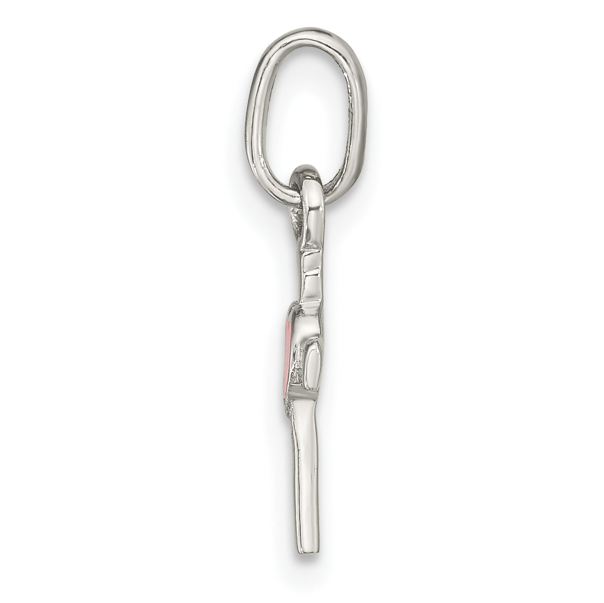 The Sterling Silver Rhodium-Plated Cross Pink Enamel Heart Pendant combines elegance and charm. Crafted from 925 sterling silver, this pendant shines with a polished finish and a touch of pink enamel. Measuring 18.61 mm in length, with a width of 7.42 mm, it features a heart-shaped charm, reflecting love and faith. The rhodium plating adds a durable, shiny silver tone. Designed for young girls, this solid piece is perfect for any occasion, offering both style and sentimental value. Embrace the grace and meaning of the Sterling Silver Rhodium-Plated Cross Pink Enamel Heart Pendant.