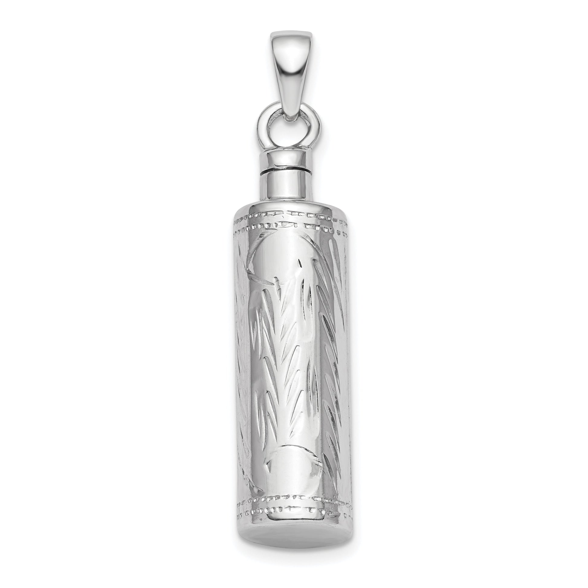 The Sterling Silver Rhodium-Plated Cylinder Ash Holder Pendant is an elegant memento blending style and sentiment. Crafted from 925 sterling silver with a polished rhodium finish, this pendant shines with a silver tone. Measuring 40 mm in length, its diamond-cut texture adds a touch of sophistication. The cylinder opens to hold ashes, making it a special keepsake. At 8 mm wide, the pendant complements any attire. With a 3D design, its sturdy bail is 6 mm long, ensuring secure wear. This Sterling Silver Rhodium-Plated Cylinder Ash Holder Pendant is a heartfelt tribute, perfect for remembering loved ones.