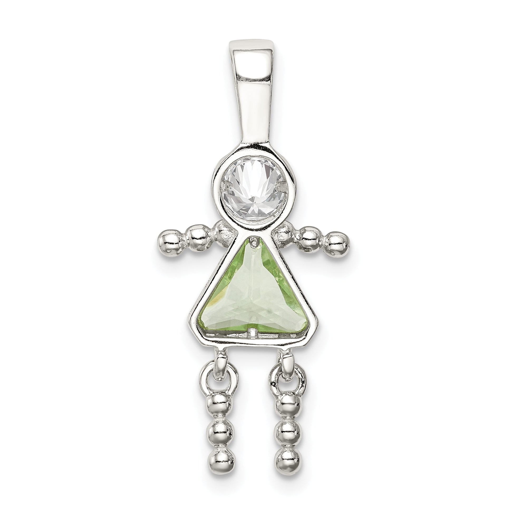 Introducing the Sterling Silver Rhodium-Plated CZ and August Glass Girl Pendant—an exquisite piece that truly elevates any outfit. This pendant features a 30mm sterling silver design with a lustrous rhodium finish, enhancing its durability and shine. The centerpiece is a synthetic green August glass, accompanied by clear cubic zirconia for a timeless look. Crafted with precision, this birthstone pendant celebrates the essence of August. Measuring 11mm in width, its solid structure ensures longevity. The Sterling Silver Rhodium-Plated CZ and August Glass Girl Pendant makes a meaningful gift for anyone born in August, offering elegance and personal charm.