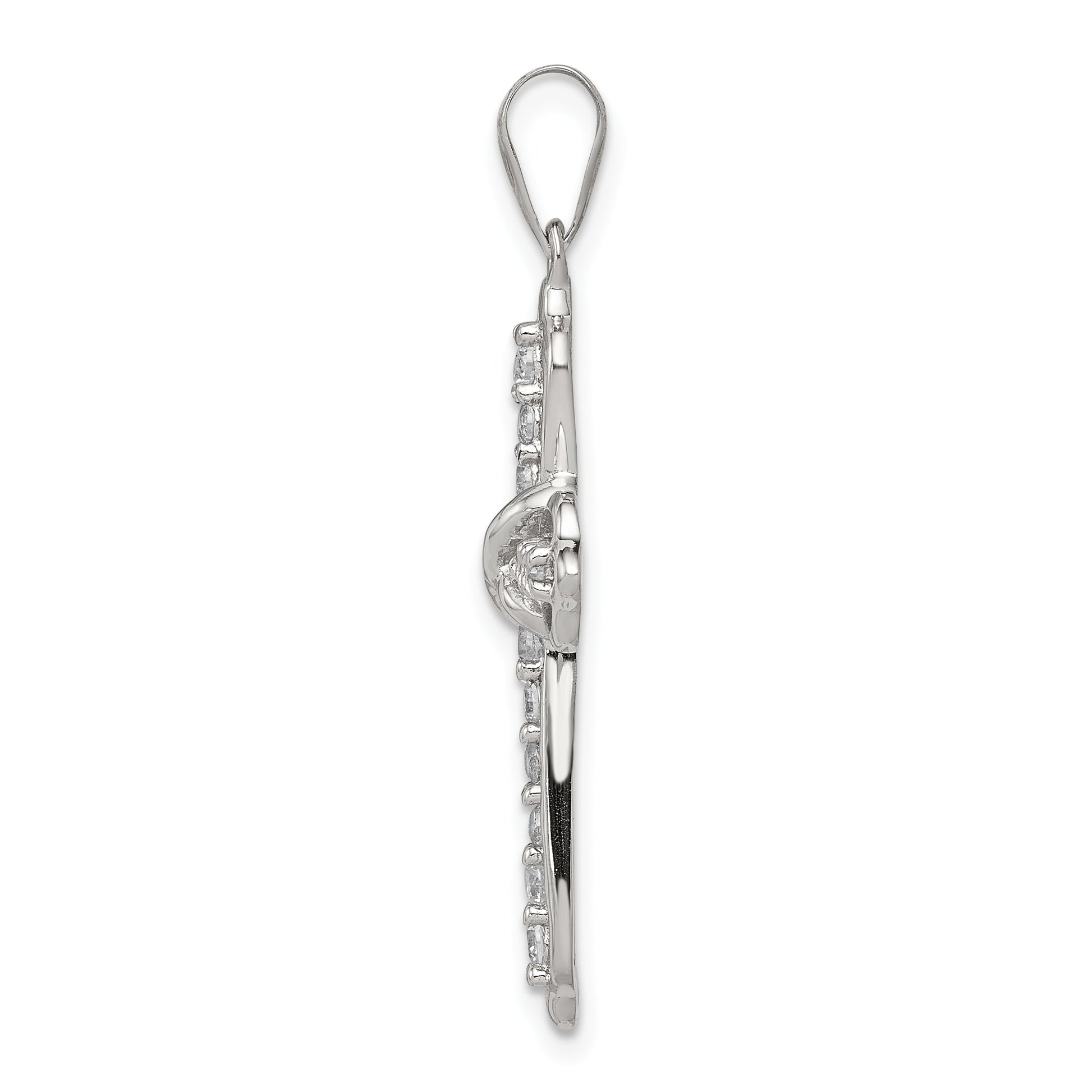 Introducing the Sterling Silver Rhodium-Plated Cz Cross Pendant—a timeless addition to your jewelry collection. Crafted from 925 sterling silver, this pendant sparkles with clear cubic zirconia stones in a polished finish that catches the eye. The rhodium plating adds a silver tone that enhances shine and longevity. The pendant measures 35 mm in length and showcases an open-back design for a lightweight feel. This complete piece features synthetic stones, ensuring brilliance and durability. Elevate any outfit with the elegance of the Sterling Silver Rhodium-Plated Cz Cross Pendant.