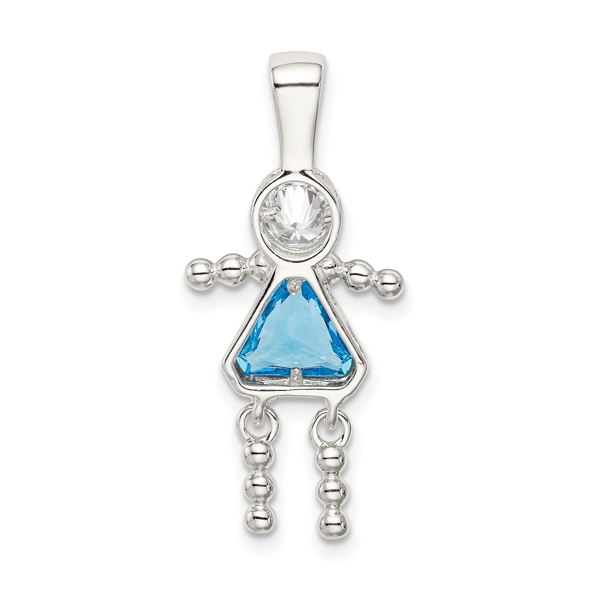 Introducing the Sterling Silver Rhodium-Plated CZ & December Glass Girl Pendant. Crafted with love, this 925 sterling silver pendant radiates elegance. The beautiful blue glass and clear cubic zirconia add a dash of sparkle that's sure to turn heads. The rhodium plating enhances its shine and offers added protection. Designed with a charming girl motif, it measures 30mm in length and 11mm in width, making it a perfect fit for any outfit. Celebrate December's birthstone with this exquisite piece, showcasing synthetic stones that captivate with their vibrant hue. The Sterling Silver Rhodium-Plated CZ & December Glass Girl Pendant is a timeless addition to any jewelry collection.