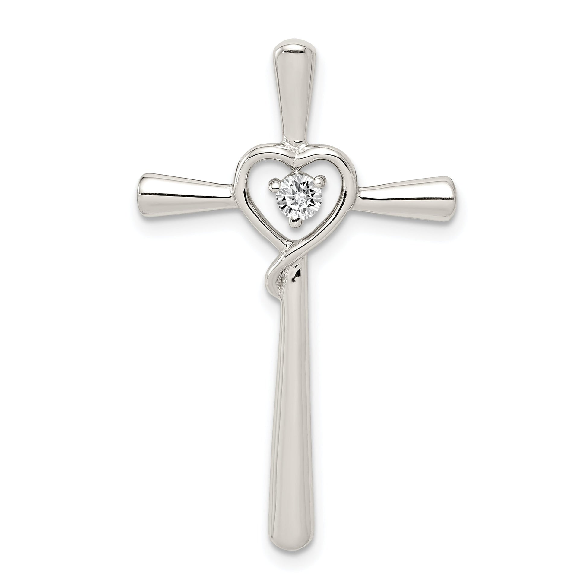 Discover the timeless elegance of the Sterling Silver Rhodium-Plated CZ Heart Cross Pendant. Carefully crafted from sterling silver, this pendant flaunts a sleek rhodium plating, giving it a radiant silver tone. At its heart, the pendant features dazzling clear cubic zirconia stones, offering a sparkle similar to diamonds. Measuring 36 mm in length and 22 mm in width, its refined profile captivates attention while remaining stylishly subtle. The concave design adds depth, making it perfect for any occasion. The Sterling Silver Rhodium-Plated CZ Heart Cross Pendant completes your look with elegance and grace, making it an ideal addition to your jewelry collection.
