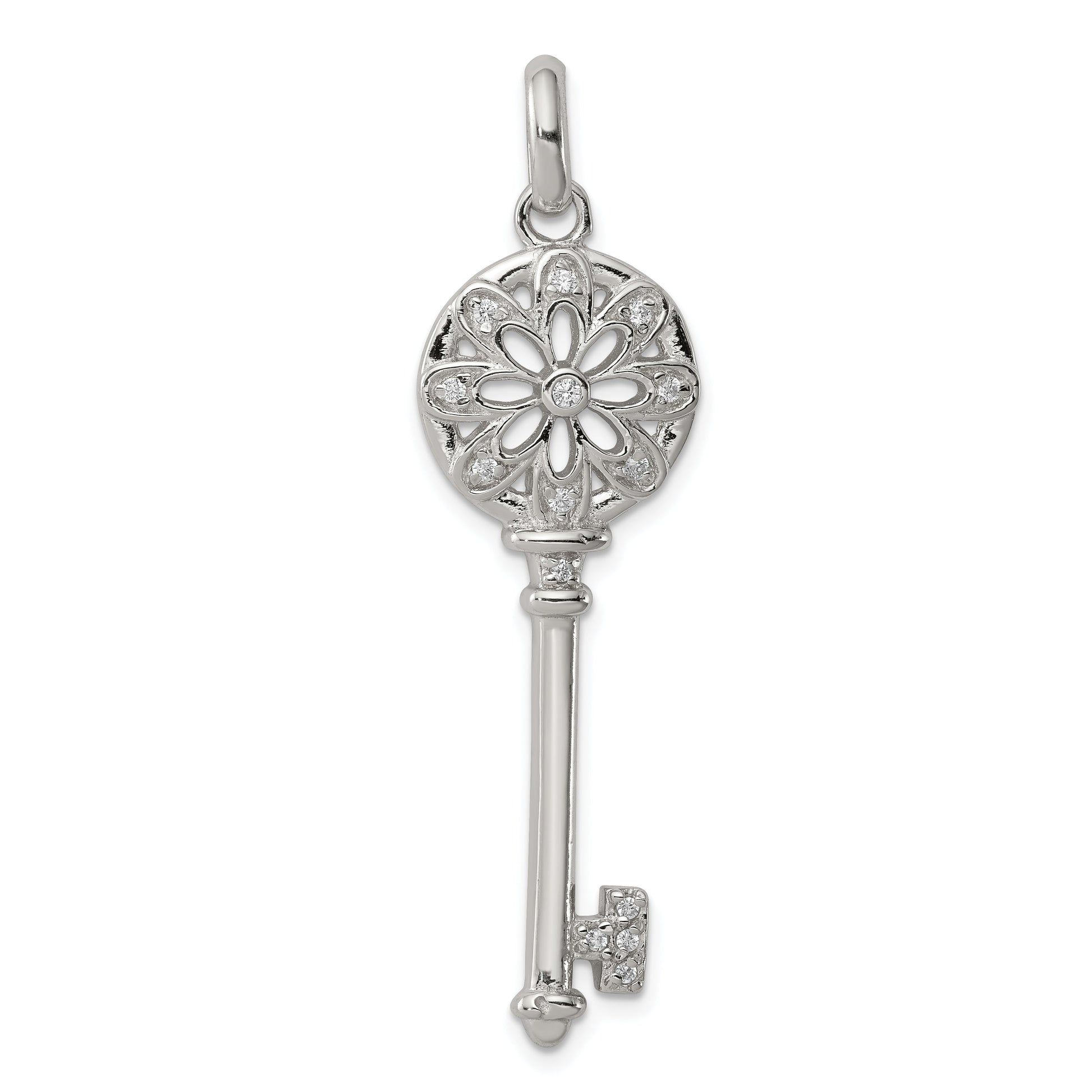 Unlock a touch of elegance with the Sterling Silver Rhodium-Plated CZ Key Pendant. Crafted from genuine 925 sterling silver, this exquisite piece dazzles with a brilliant, clear cubic zirconia that promises a sparkle in every light. The pendant, polished and rhodium-plated, boasts a lustrous silver tone that enhances its timeless allure. Measuring 49 mm in length and 14 mm in width, this themed pendant is a perfect accessory for any occasion. With its synthetic yet stunning stone, the Sterling Silver Rhodium-Plated CZ Key Pendant makes for an ideal gift or a cherished addition to your jewelry collection.