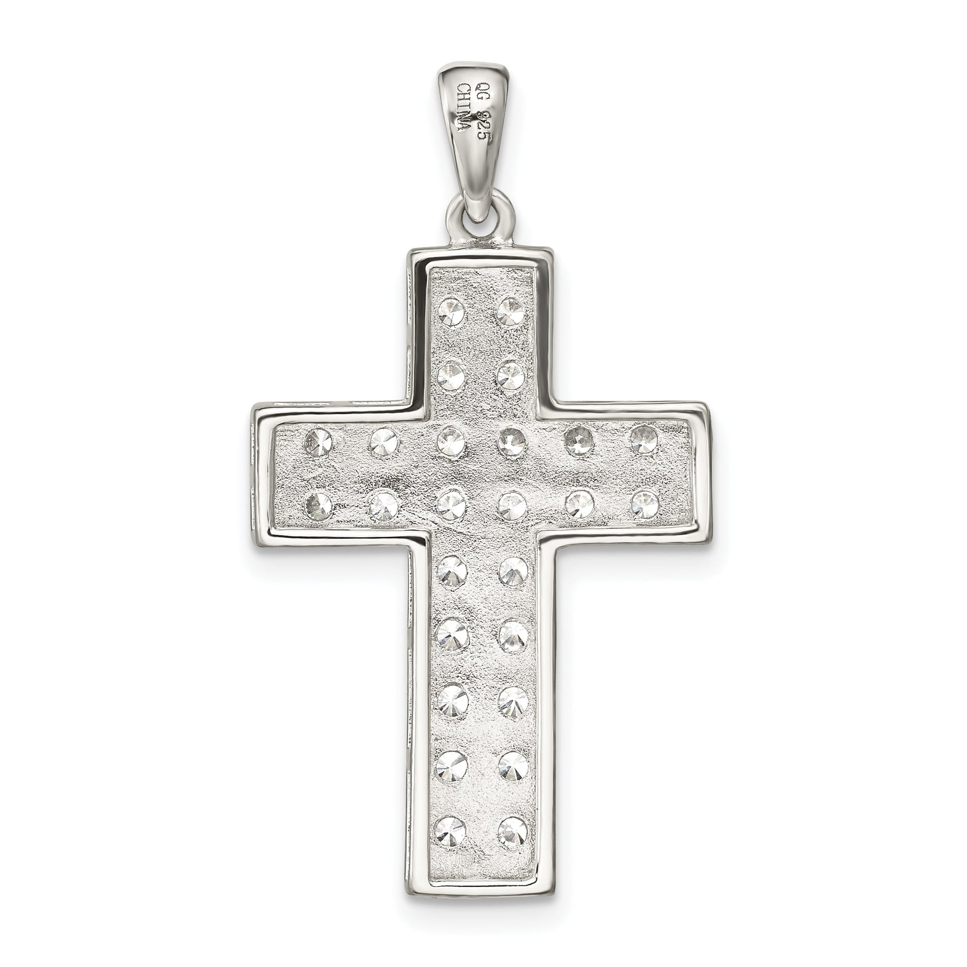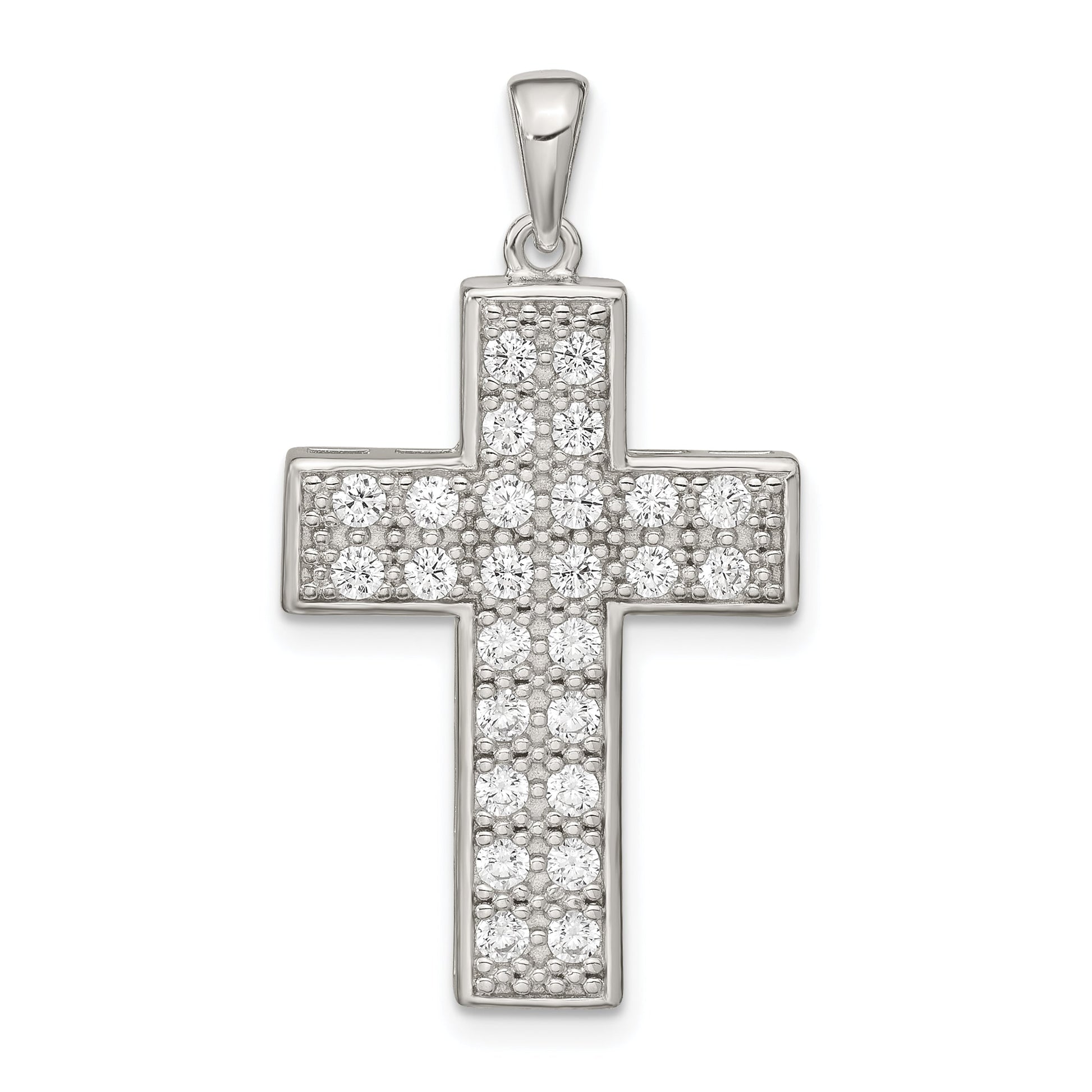 The Sterling Silver Rhodium-Plated CZ Latin Cross Pendant is a stunning piece that blends elegance with spiritual symbolism. Crafted from 925 sterling silver, this beautiful pendant showcases a polished finish and is plated with rhodium to enhance its luster. Adorned with sparkling cubic zirconia stones, which are synthetically created for exceptional brilliance, the pendant measures 43mm in length and 22mm in width. Its Latin cross design adds a timeless touch. This pendant is perfect for those seeking both style and meaning. Wear the Sterling Silver Rhodium-Plated CZ Latin Cross Pendant to express your faith and elevate your outfit effortlessly.