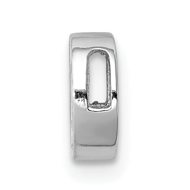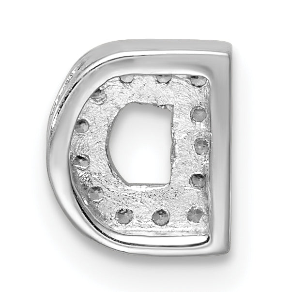 The Sterling Silver Rhodium-Plated CZ Letter D Initial Slide Charm pays homage to timeless beauty and personal style. Crafted from 925 sterling silver with a shimmering rhodium finish, this charm promises lasting brilliance. It features a synthetic cubic zirconia, offering a clear sparkle that rivals its natural counterparts. The charm's silver tone plating further enhances its elegant look. Designed to be solid and durable through advanced casting, this charm keeps its charming appearance. Wear the Sterling Silver Rhodium-Plated CZ Letter D Initial Slide Charm to bring a dash of personalized flair.
