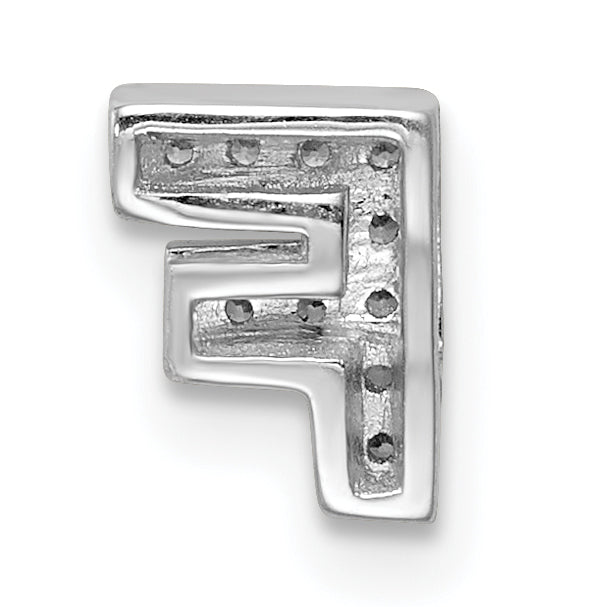 The Sterling Silver Rhodium-Plated Cz Letter F Initial Slide Charm adds a personal flair to any jewelry collection. Expertly crafted from 925 sterling silver, it features a sleek rhodium plating for a lasting shine. Embedded with clear cubic zirconia stones, this charm offers a sparkling touch that rivals diamonds. With its synthetic gem creation, it maintains quality and allure. Its solid, casted construction ensures durability, making this charm a long-lasting addition to your wardrobe. Perfect for those seeking a mix of elegance and individuality, the Sterling Silver Rhodium-Plated Cz Letter F Initial Slide Charm stands out beautifully.