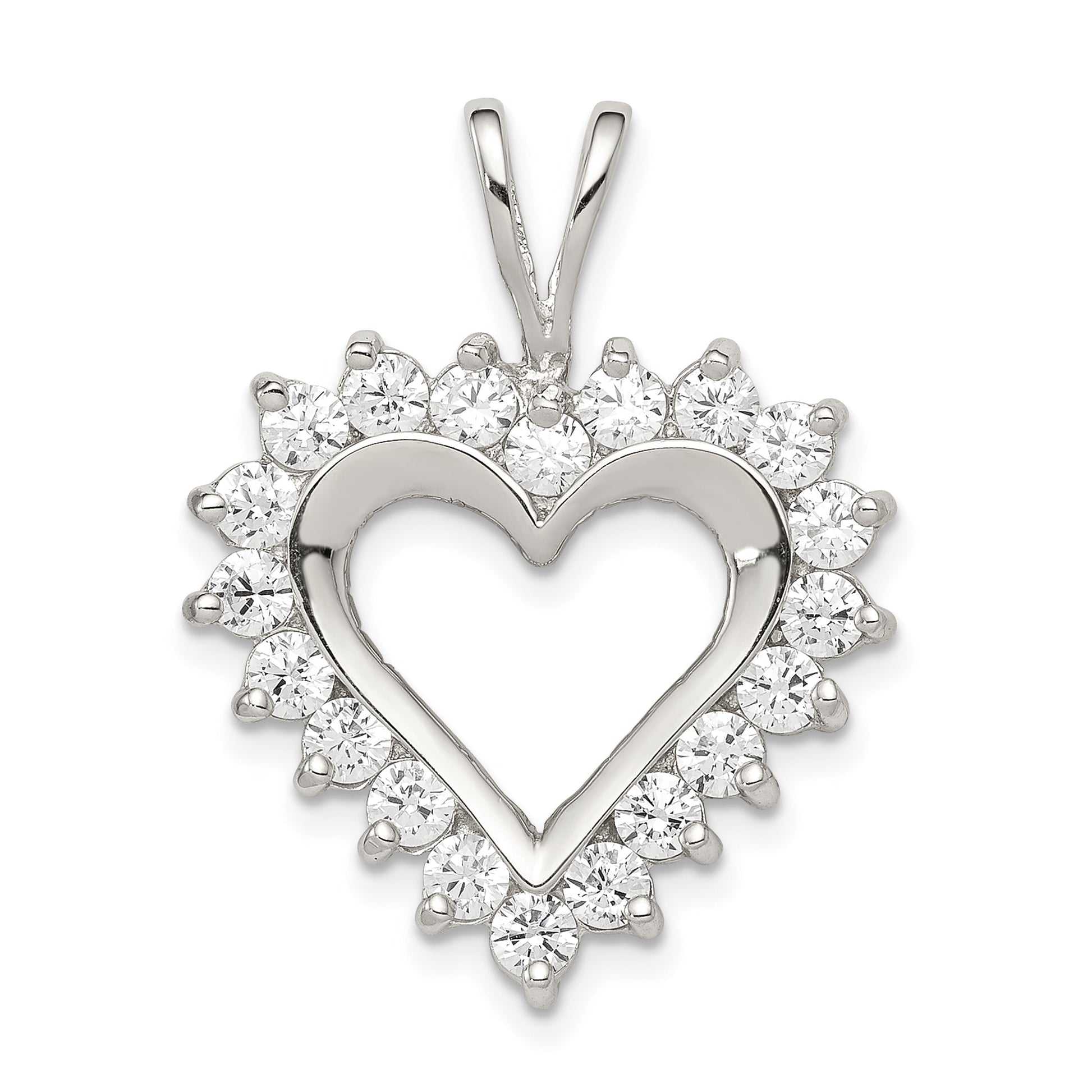 Introducing the Sterling Silver Rhodium-Plated CZ Open Heart Pendant, a masterpiece in any jewelry collection. Crafted from high-quality 925 sterling silver, it gleams with a polished finish. The pendant is adorned with stunning synthetic cubic zirconia stones that sparkle like the night sky. Coated with rhodium, this eye-catching piece resists tarnishing, ensuring long-lasting shine. The open heart design, measuring 27 mm in length and 21 mm in width, symbolizes love and elegance. Complete your look with this timeless Sterling Silver Rhodium-Plated CZ Open Heart Pendant, perfect for any occasion.