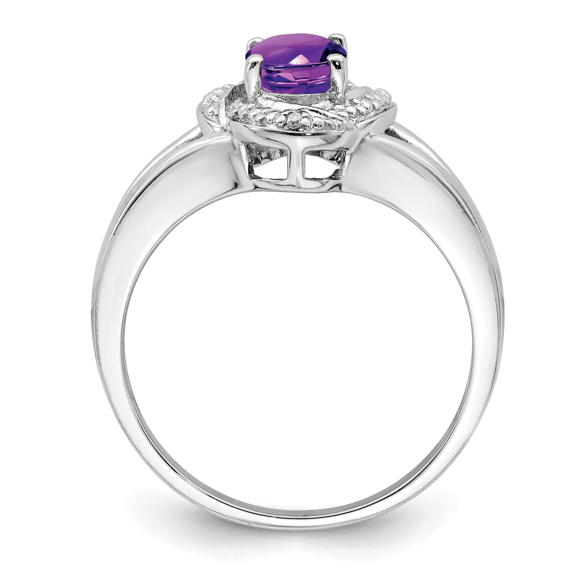 The Sterling Silver Rhodium-Plated Diamond & Amethyst Ring brings elegance to any look. Crafted from high-quality 925 sterling silver, this ring showcases a stunning 0.75-carat oval amethyst. The rich purple stone is prong-set and faceted, revealing vibrant flashes with every move. Complementing this centerpiece are dainty diamonds, adding subtle shimmer at a weight of 0.010 ctw. The rhodium plating gives this piece a polished shine and durability. With a sleek band width of 2 mm, it promises comfort on any finger. Celebrate February birthdays or simply indulge with this exquisite Sterling Silver Rhodium-Plated Diamond & Amethyst Ring.