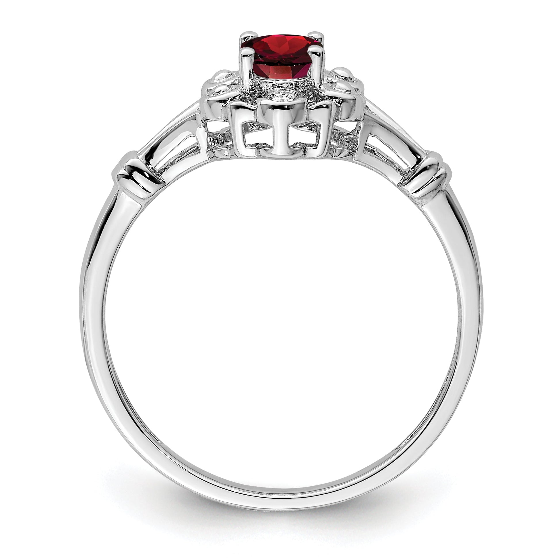 The Sterling Silver Rhodium-Plated Garnet and Diamond Ring exudes timeless charm and elegance. Crafted with authentic 925 sterling silver, the band boasts a sleek rhodium finish. At its heart lies a striking 0.55 carat natural oval garnet, flaunting fiery red tones that capture attention. Complemented by two round diamonds of 0.02 carat weight, this ring shines with a unique blend of sparkle and sophistication. Each stone snugly set using prong and bezel settings ensures durability and style. A fine choice for women seeking a gemstone ring with graceful flair. Embrace the allure of the Sterling Silver Rhodium-Plated Garnet and Diamond Ring and celebrate January's birthstone in style.