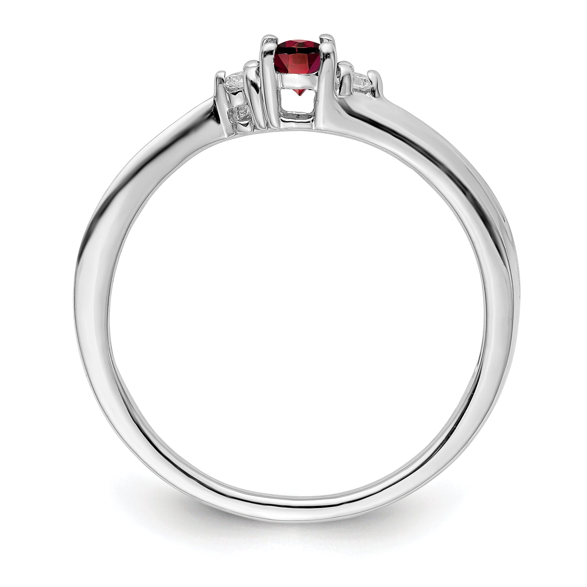 The Sterling Silver Rhodium-Plated Garnet and Diamond Birthstone Ring adds a touch of elegance to any collection. This lovely piece showcases a vibrant oval garnet with a rich red hue, flanked by two brilliant round diamonds. The stones sit proudly in rhodium-plated sterling silver, emitting a striking, polished luster. With its open-back design and tapered band width, this semi-solid ring ensures comfort while maintaining style. Celebrate a loved one born in January or a special occasion with this timeless piece of jewelry. The Sterling Silver Rhodium-Plated Garnet and Diamond Birthstone Ring offers lasting beauty and charm.