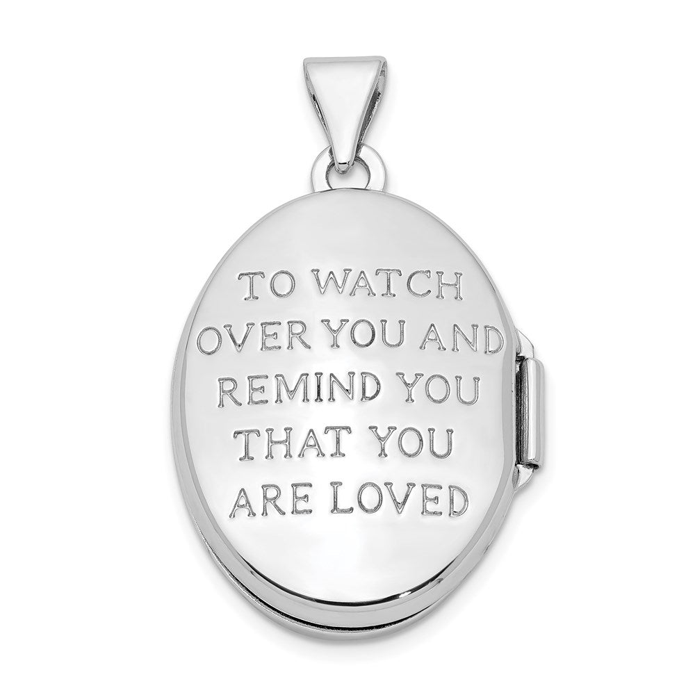 The Sterling Silver Rhodium-Plated & Gold-Plated Guardian Angel Oval Locket is an exquisite choice for a cherished keepsake. This stunning piece features a polished sterling silver design, beautifully accented with gold. The rhodium plating enhances its durability and luster, giving it a lasting shine. Measuring 28.2 mm in length and 17.1 mm in width, this locket is perfectly sized to hold two cherished 14x19.2 mm oval photos. Die-struck for precision and quality, the locket also boasts a reversible feature and a textured design for added elegance. This women's locket combines beauty with sentiment, making it an ideal gift for loved ones. Elevate your jewelry collection with the Sterling Silver Rhodium-Plated & Gold-Plated Guardian Angel Oval Locket.